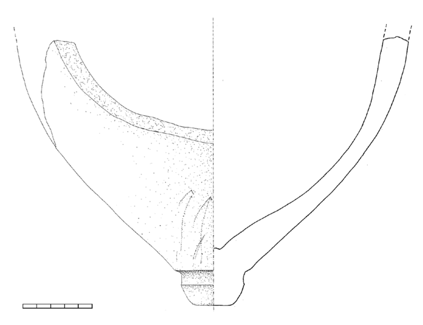 Dno amfore zaobljenog šiljka sa spojem na donji dio tijela. Keramika je žute do sive boje.