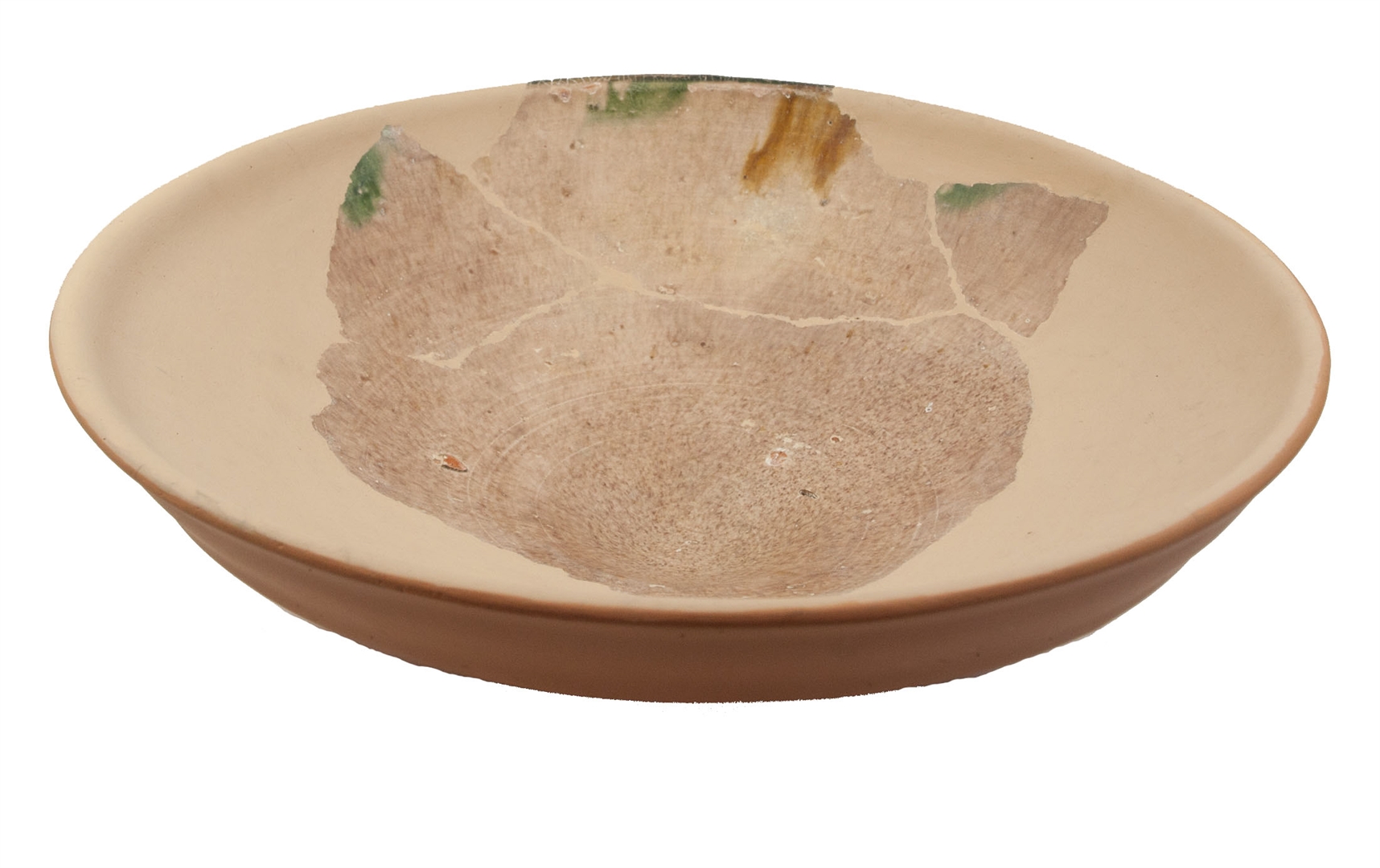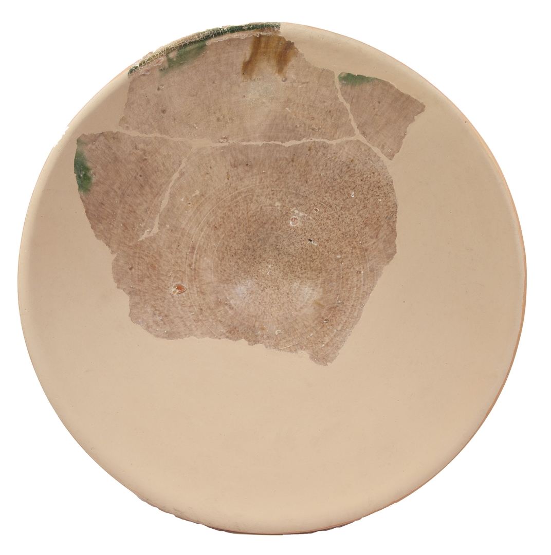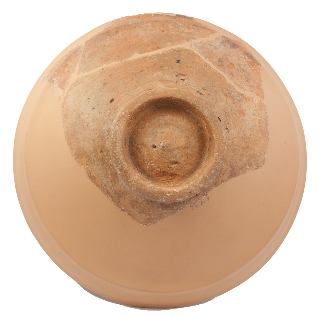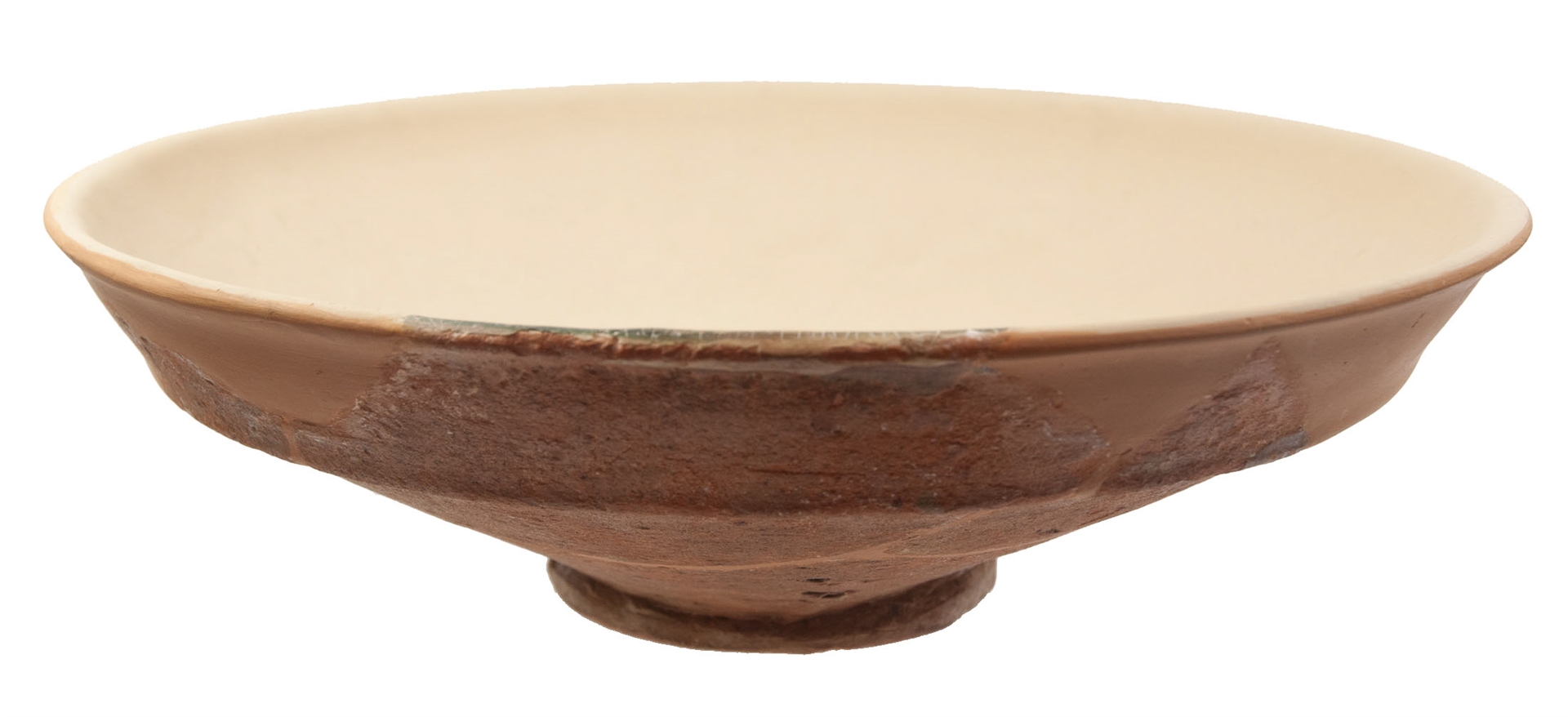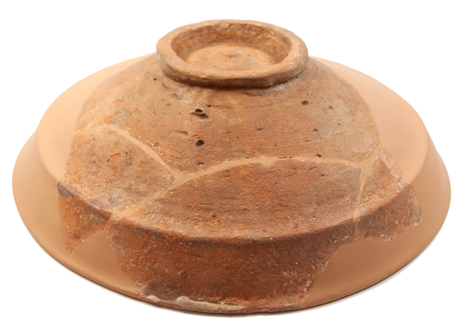 Dio plitke zdjele na prstenastoj nozi. Izrađena je od crvene, dobro pročišćene gline.