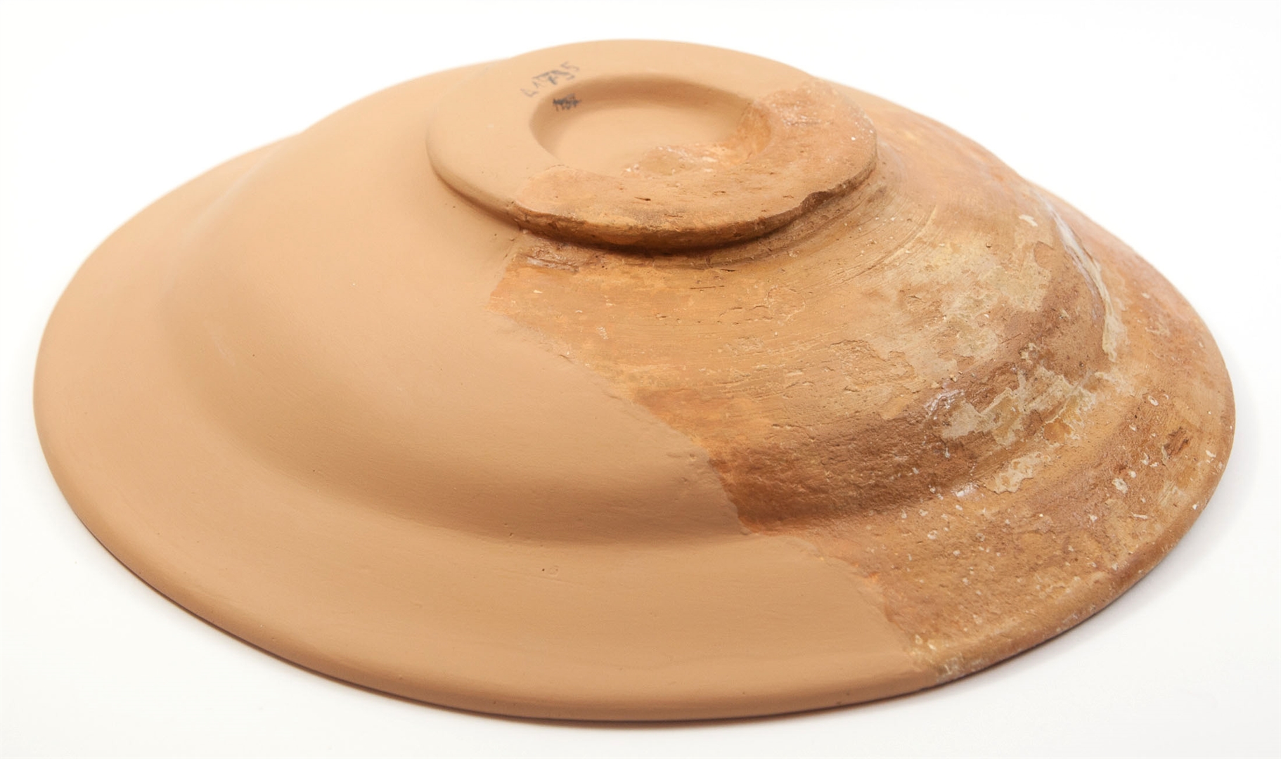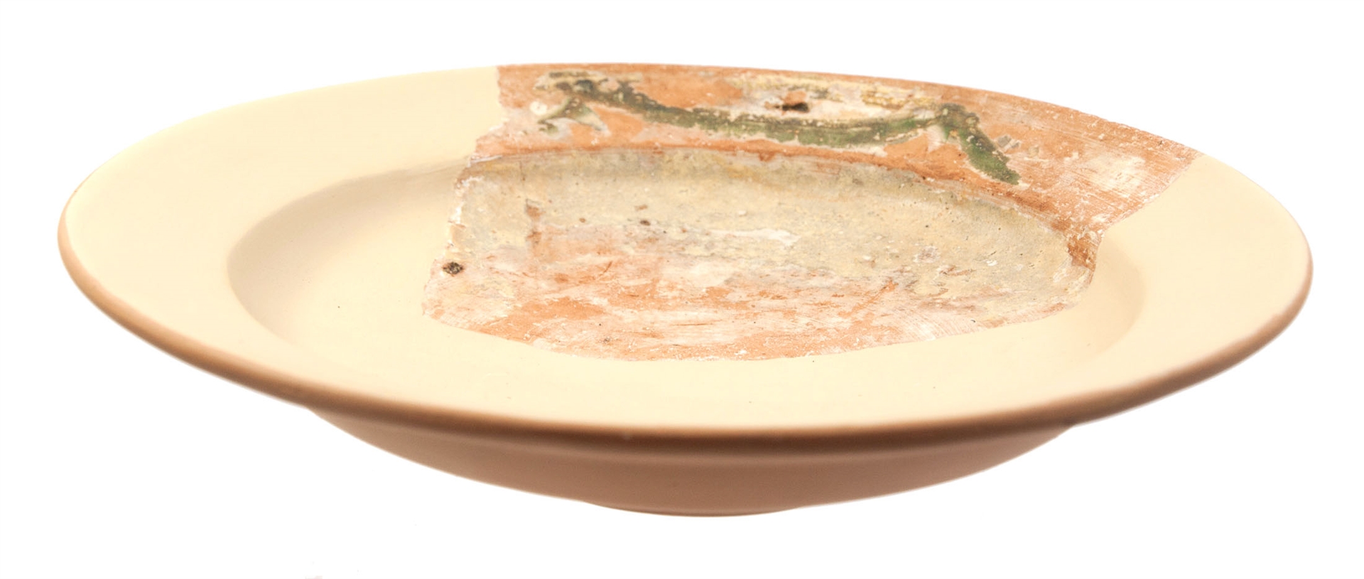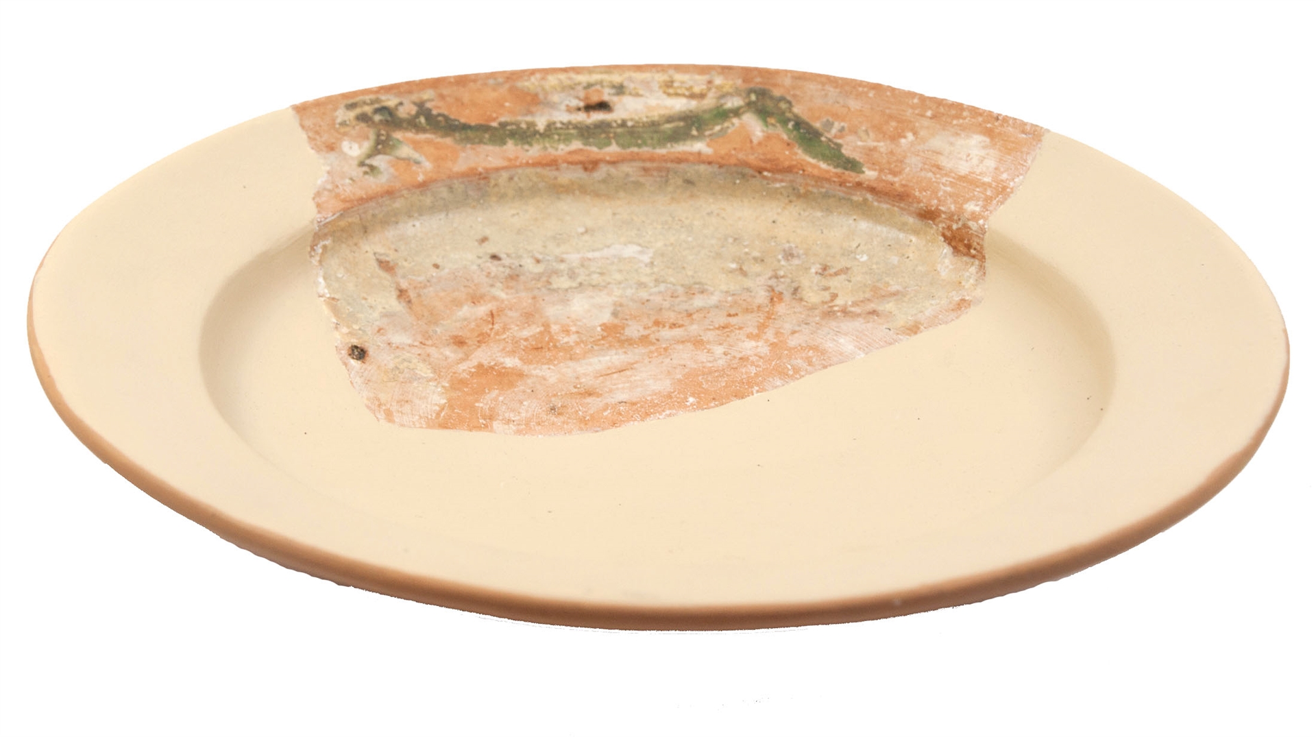 Ulomak tanjua na prstenastoj nozi. Izrađen je od crvene i dobro pročišćena glina. Ukras oslikan zelenom bojom na engobi, tehnikom odstranjenog dna.