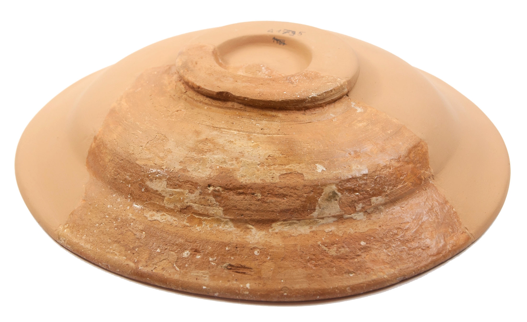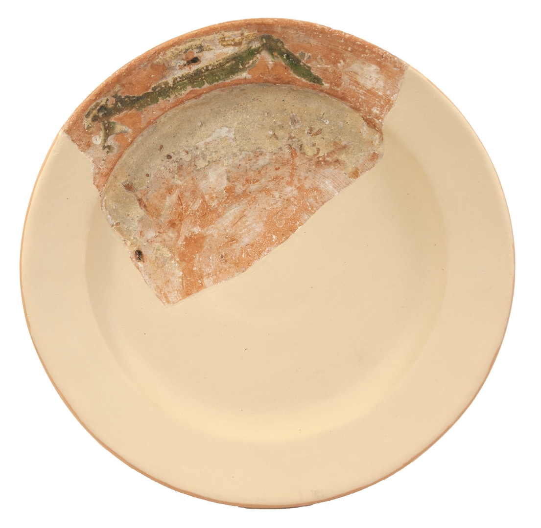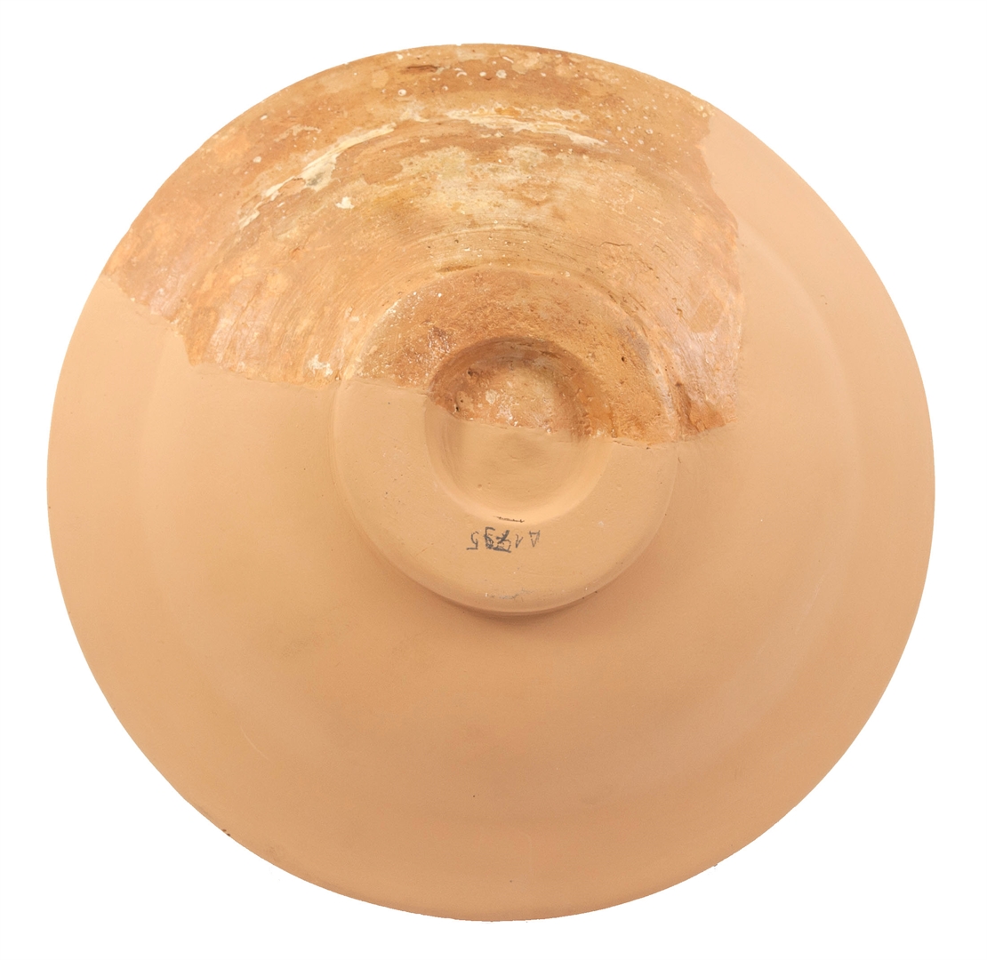 Ulomak tanjua na prstenastoj nozi. Izrađen je od crvene i dobro pročišćena glina. Ukras oslikan zelenom bojom na engobi, tehnikom odstranjenog dna.