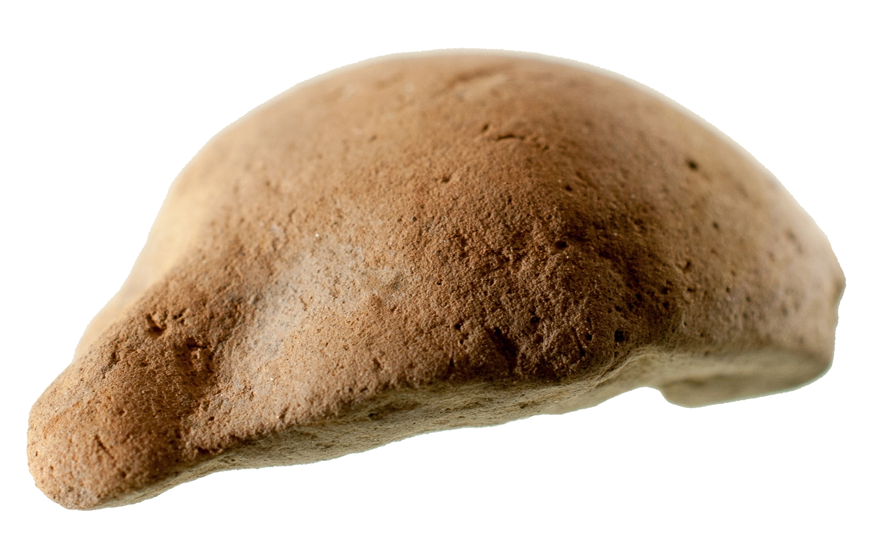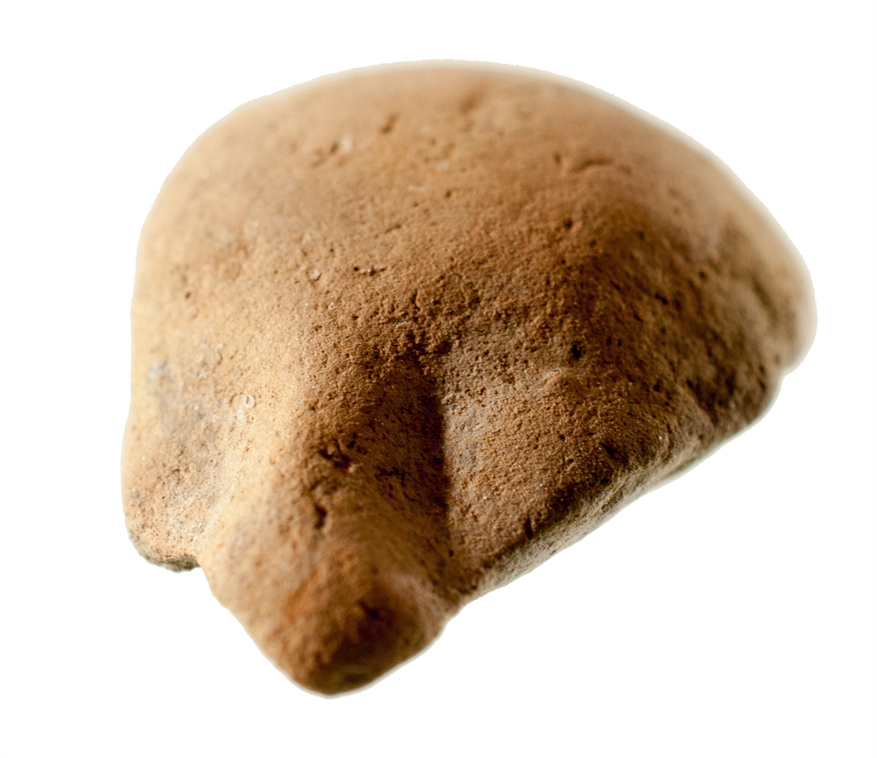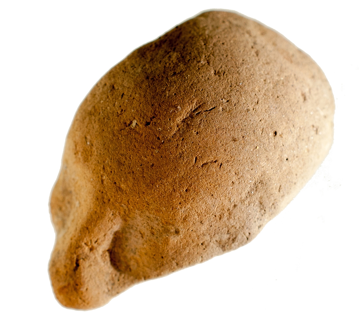 Ulomak glave keramičke figurice. Figurica šuplja iznutra. Oker, dobro pročišćena glina.
