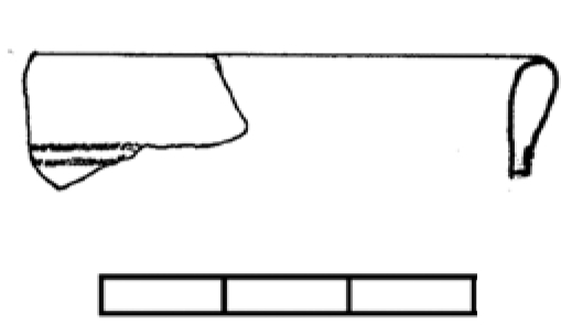 Ulomak zaobljenog zadebljanog i prema unutra uvijenog oboda s dvije urezane linije ispod oboda, prozirno malo zelenkasto staklo.