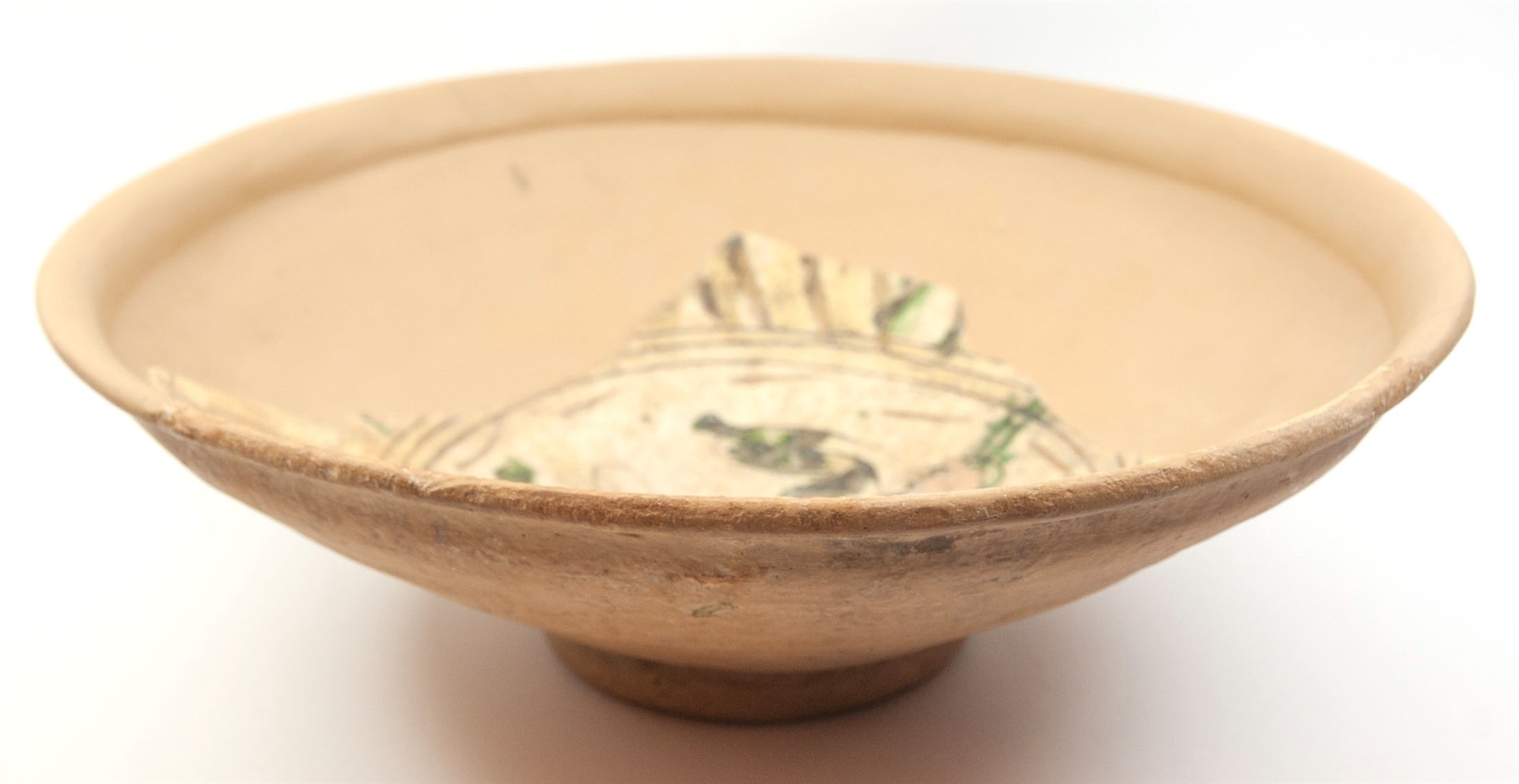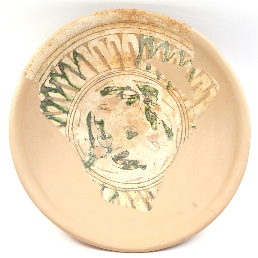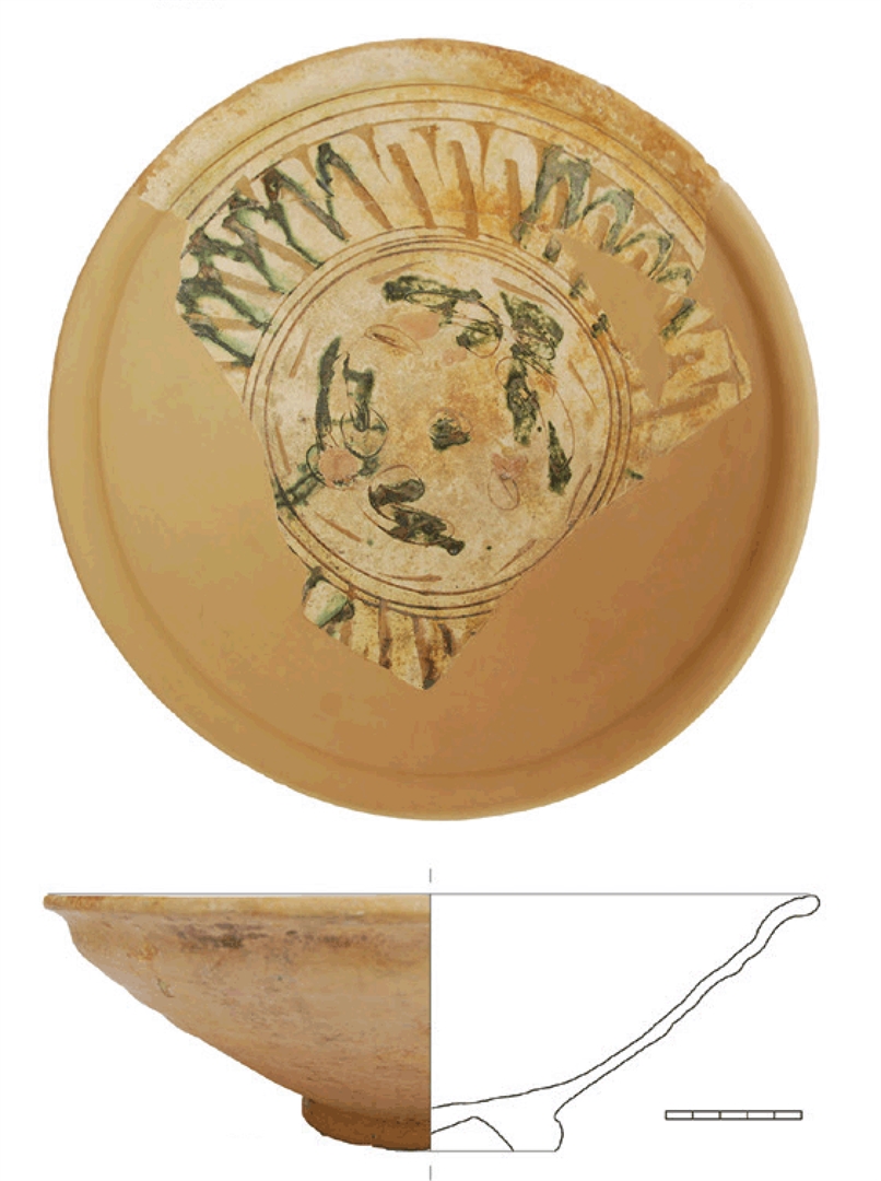 Rekonstruirana zdjela na prstenastoj nozi sa zadebljanim obodom. Izrađena je od svijetlo crvene, dobro pročišćene gline. Engoba i prozirna glazura samo na unutarnjoj strani. Na unutarnjoj strani urezani stilizirani vegetabilni i geometrijski motiv i motiv šire trake s rebrastim žljebićima (fascia a sgusci nervati). Engobirana gravirana keramika.