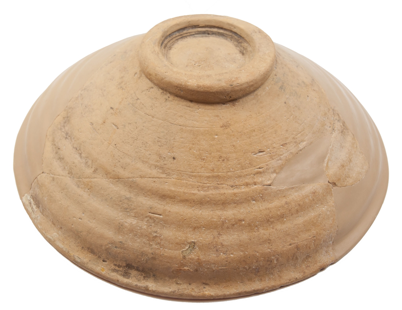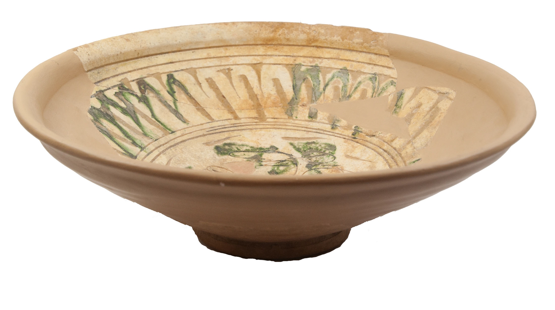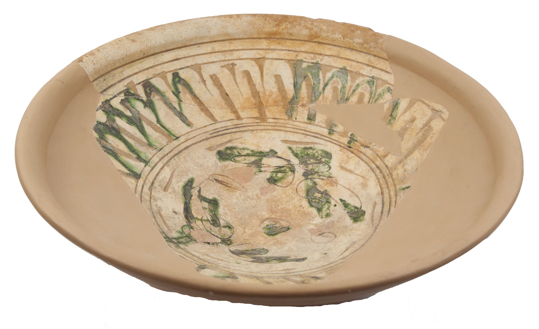 Rekonstruirana zdjela na prstenastoj nozi sa zadebljanim obodom. Izrađena je od svijetlo crvene, dobro pročišćene gline. Engoba i prozirna glazura samo na unutarnjoj strani. Na unutarnjoj strani urezani stilizirani vegetabilni i geometrijski motiv i motiv šire trake s rebrastim žljebićima (fascia a sgusci nervati). Engobirana gravirana keramika.
