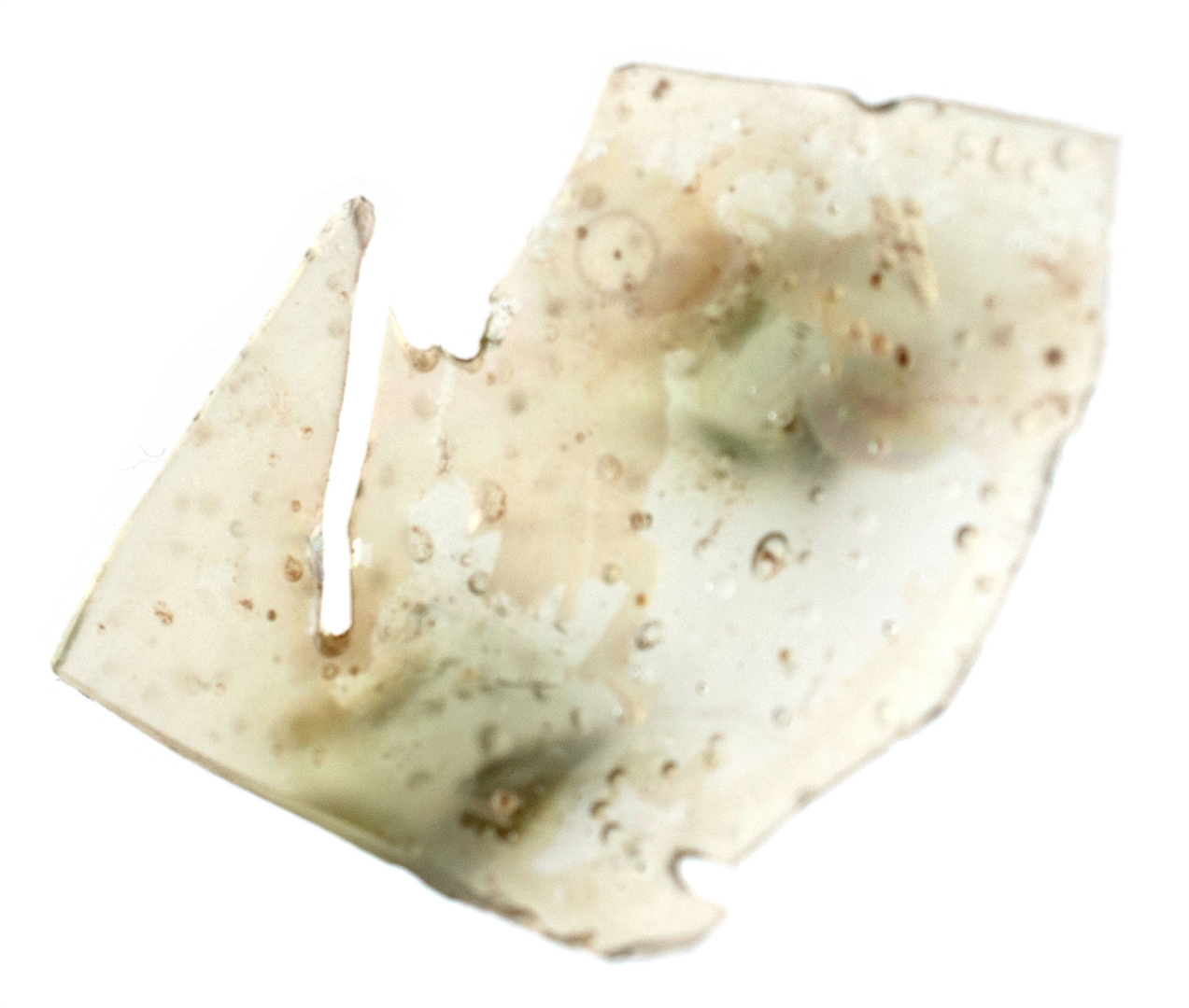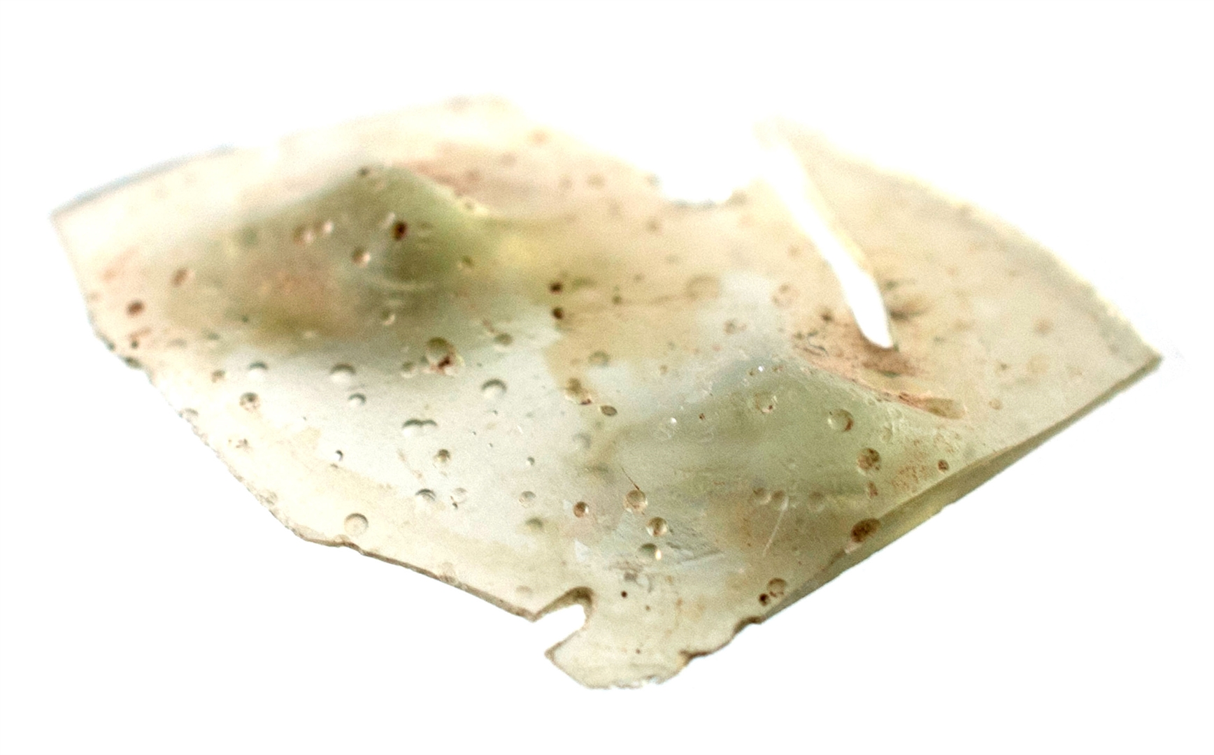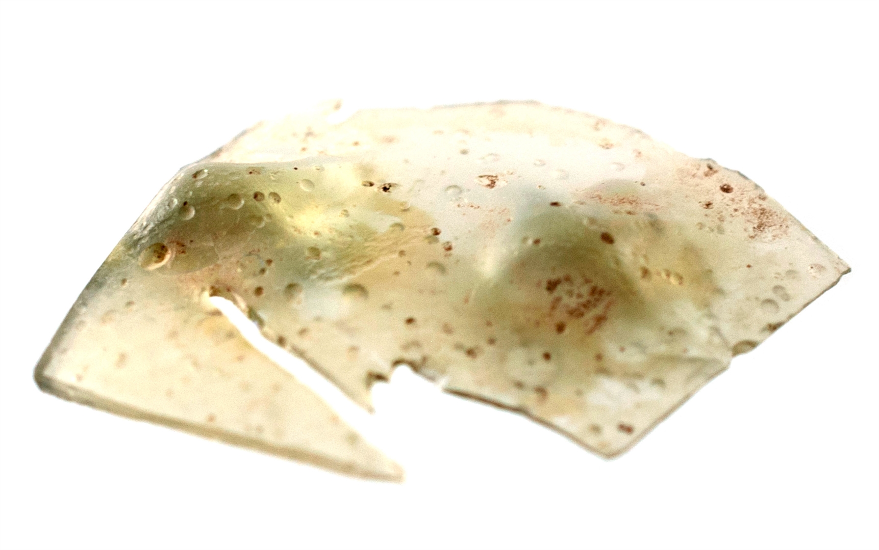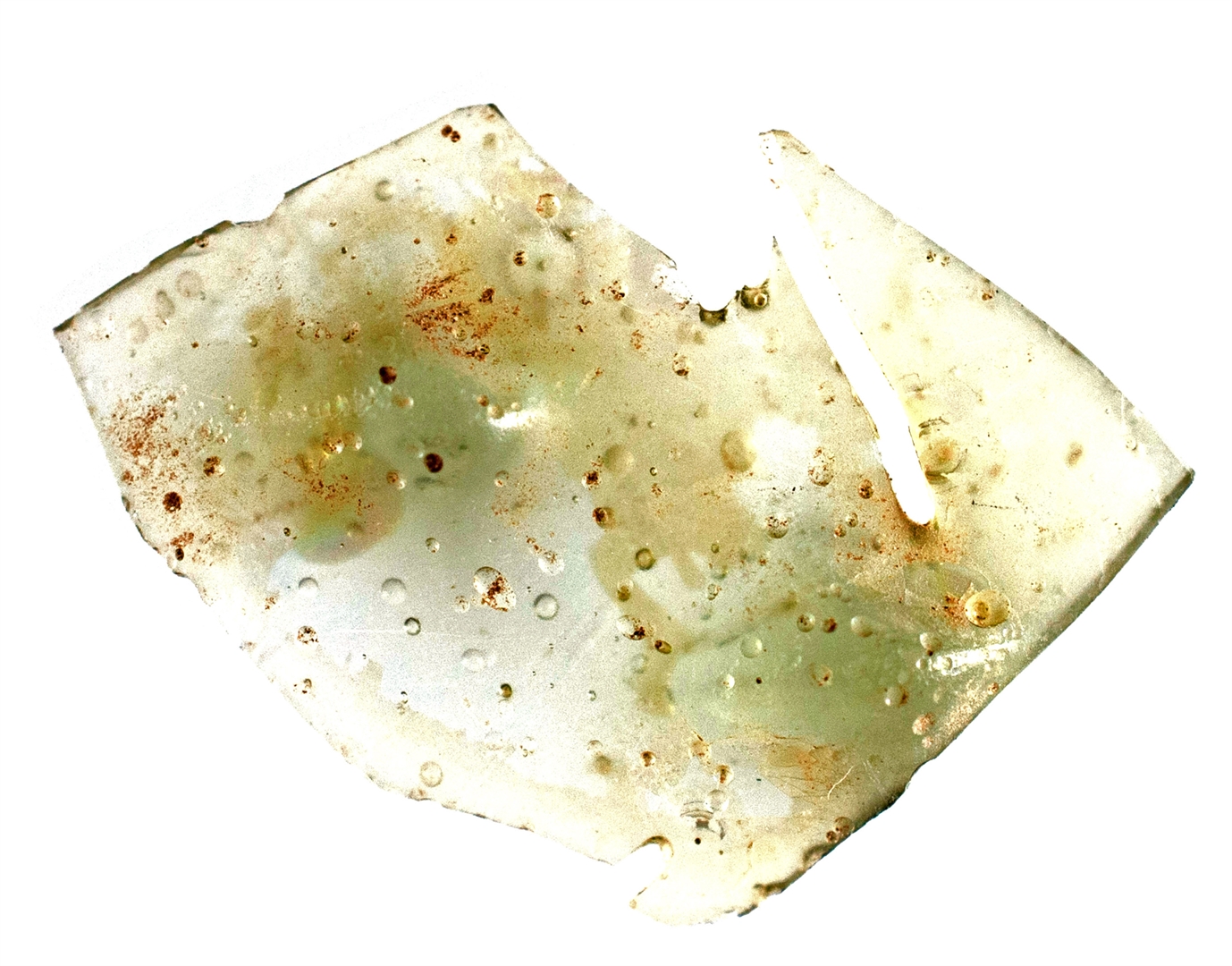 Svjetlozeleni ulomaj staklene stjenke s dva ispupčenja.