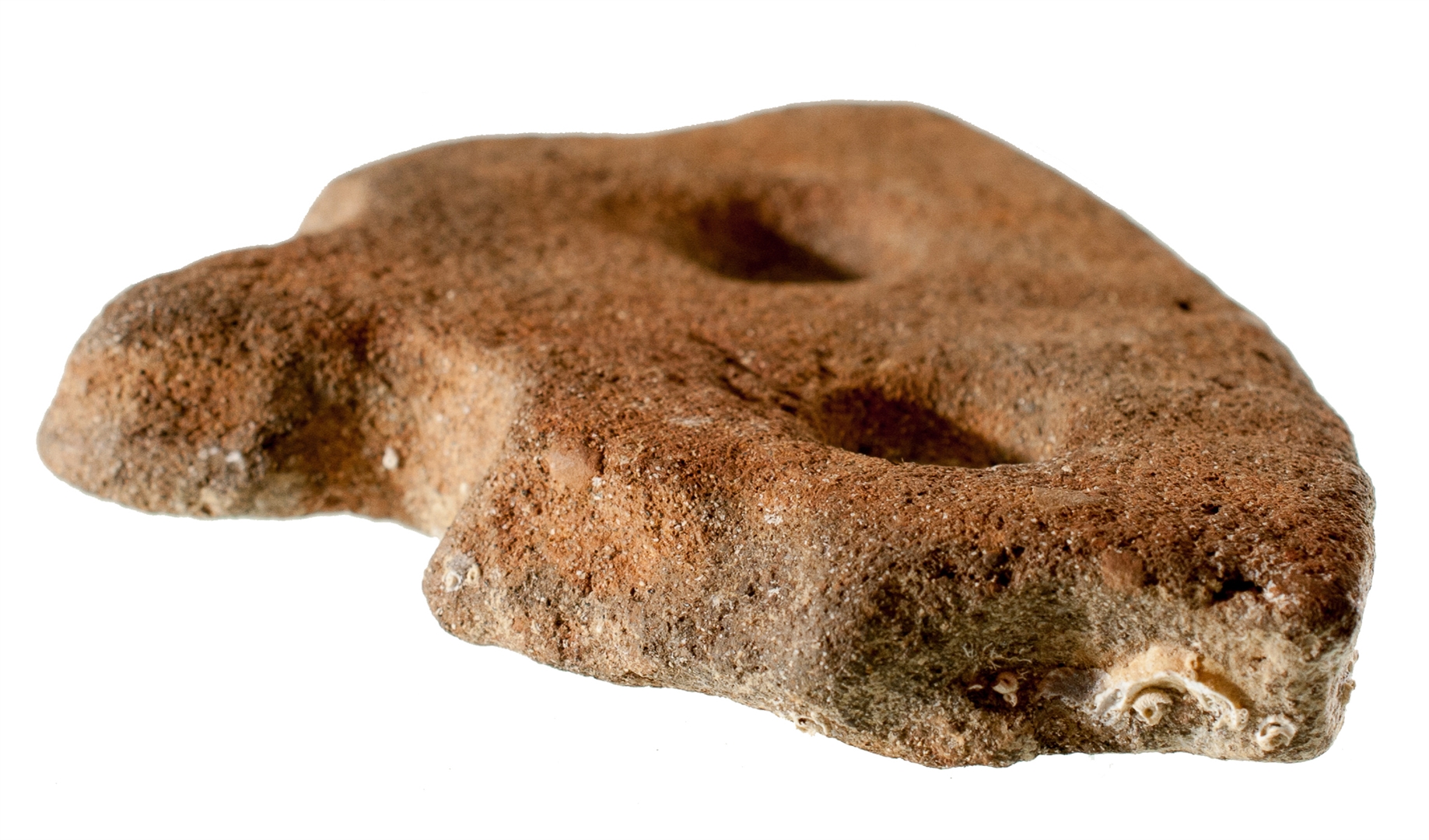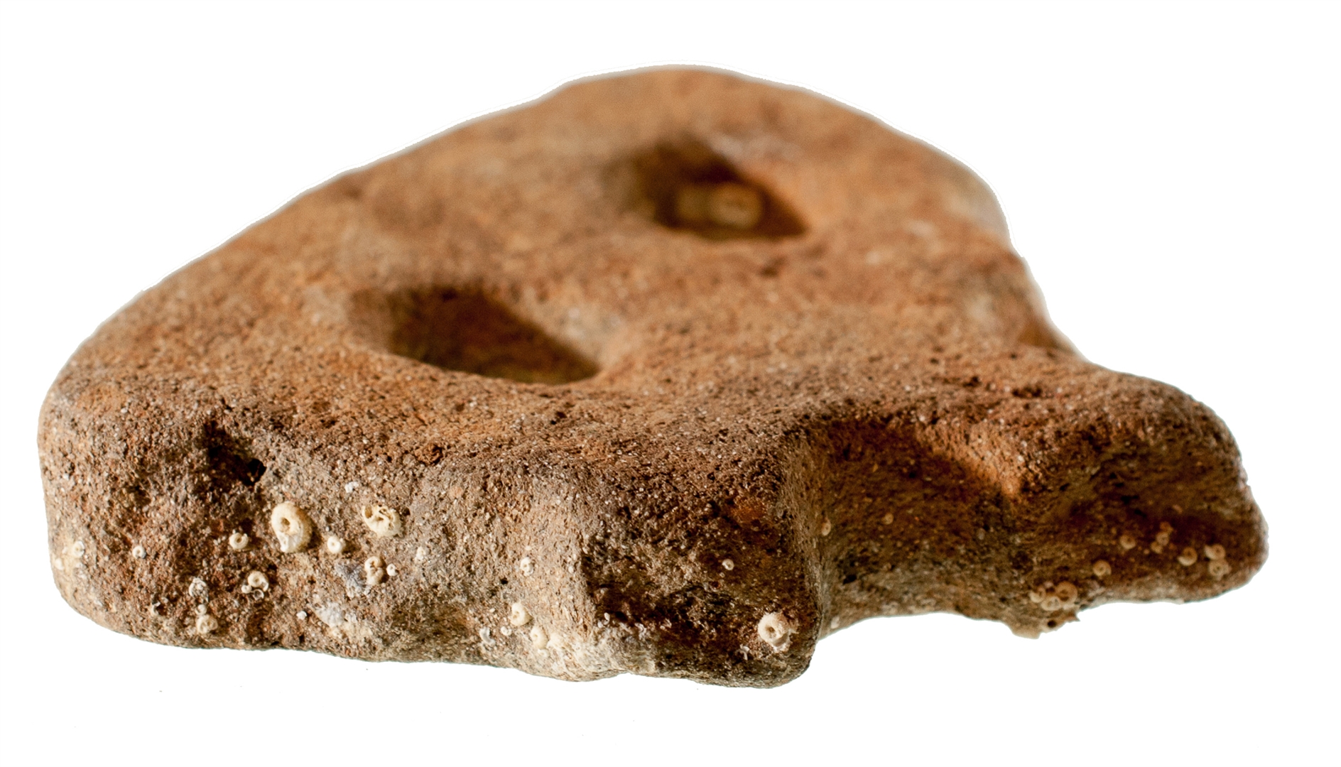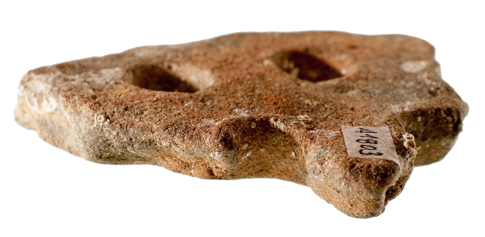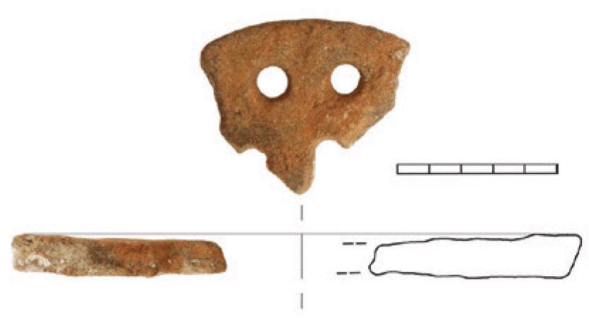 Ulomak keramičkog poklopca s rupama. Rub poklopca lagano zakošen prema unutra. Smeđa, loše pročišćena glina sa sitnim zrncima.