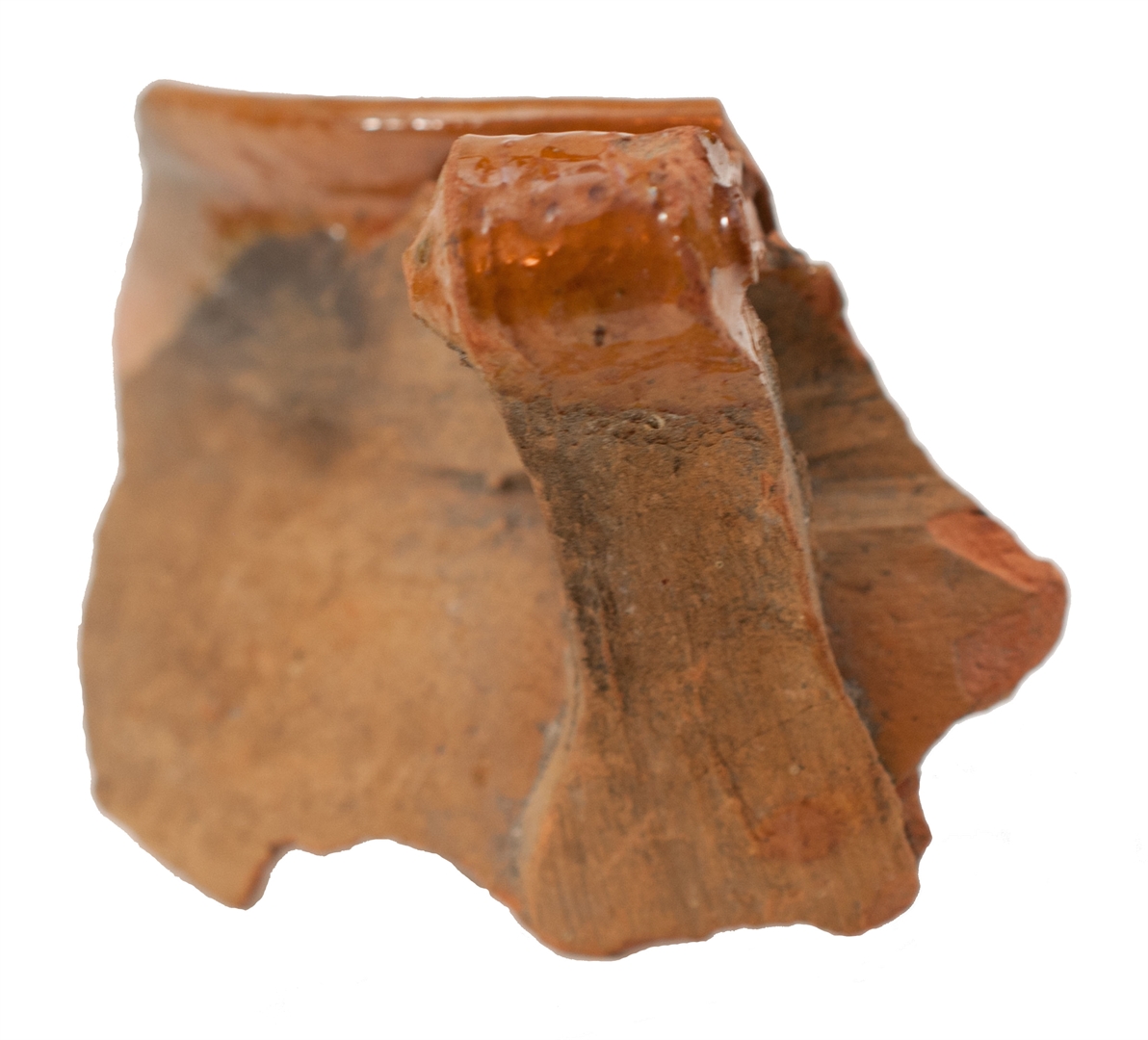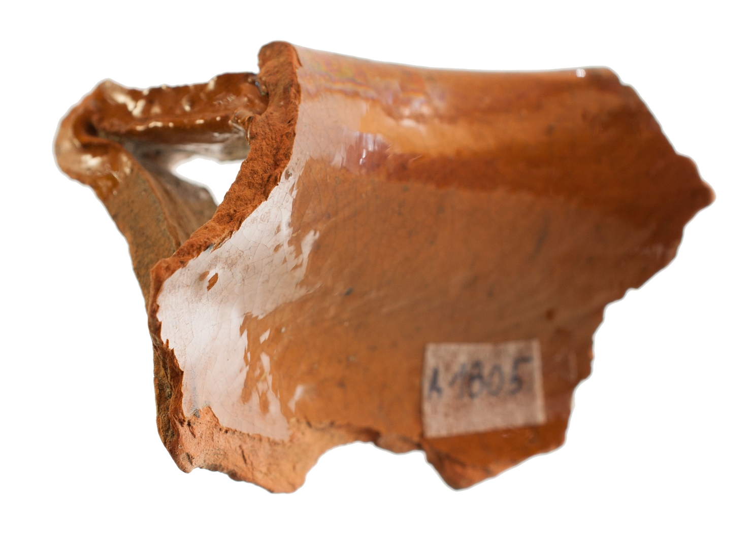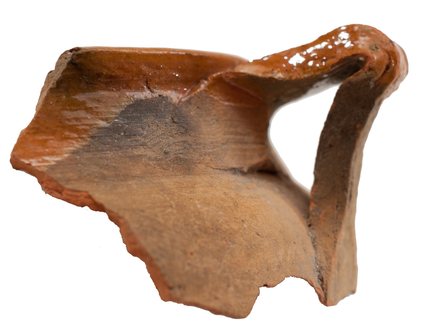 Ulomak lonca s izvijenim obodom ispod kojeg započinje trakasta ručkica koja završava na sredini trbuha. Izrađen je od crvene, dobro pročišćene gline. Prozirna glazura na unutarnjoj strani, a s vanjske samo na obodu i na gornjem dijelu ručkice. Invetriata.