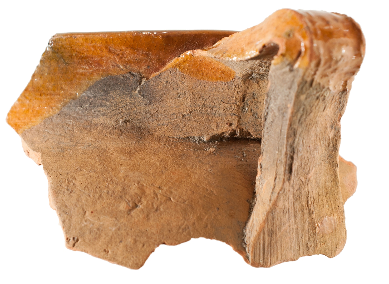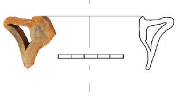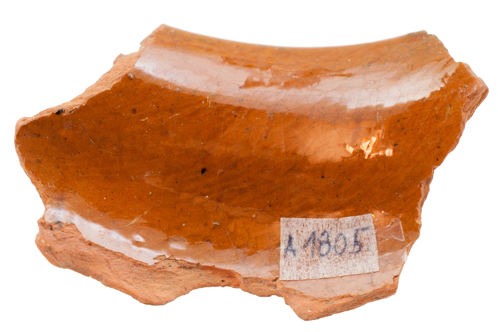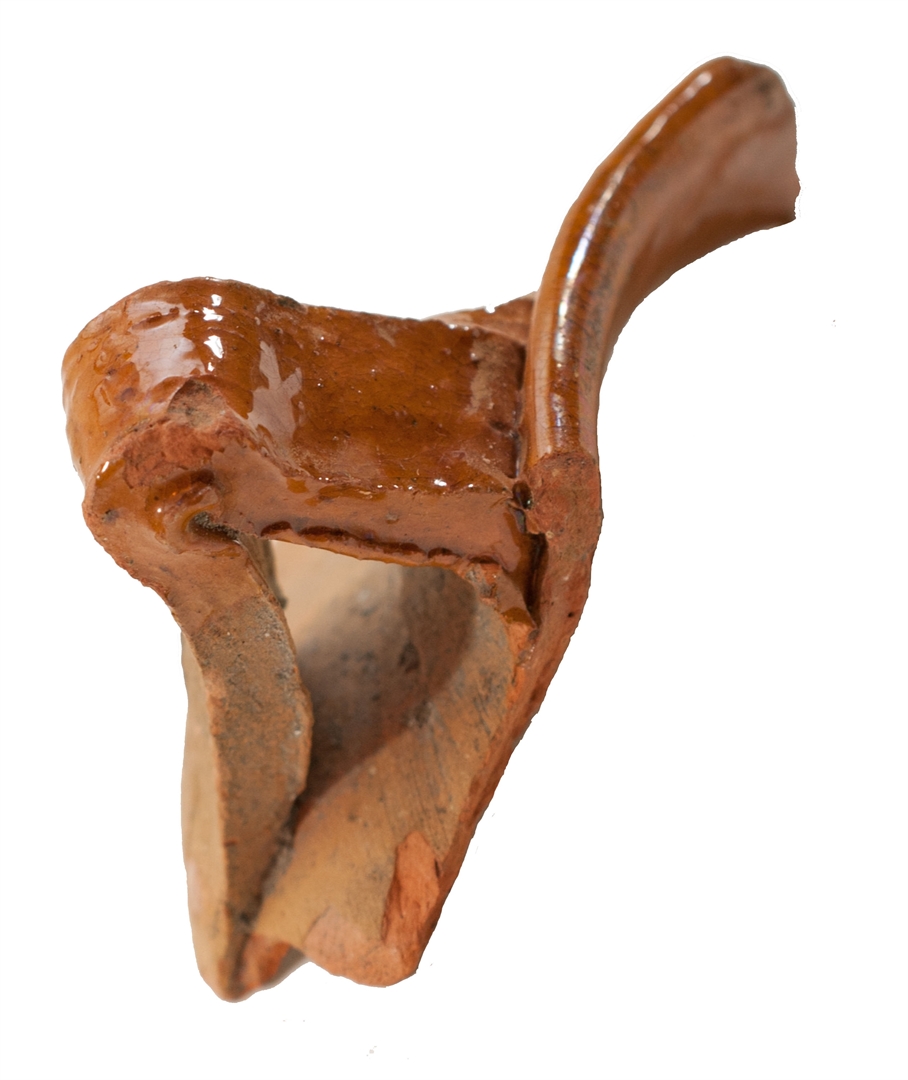 Ulomak lonca s izvijenim obodom ispod kojeg započinje trakasta ručkica koja završava na sredini trbuha. Izrađen je od crvene, dobro pročišćene gline. Prozirna glazura na unutarnjoj strani, a s vanjske samo na obodu i na gornjem dijelu ručkice. Invetriata.