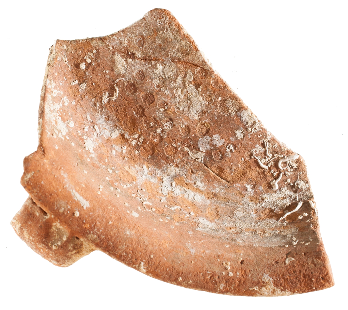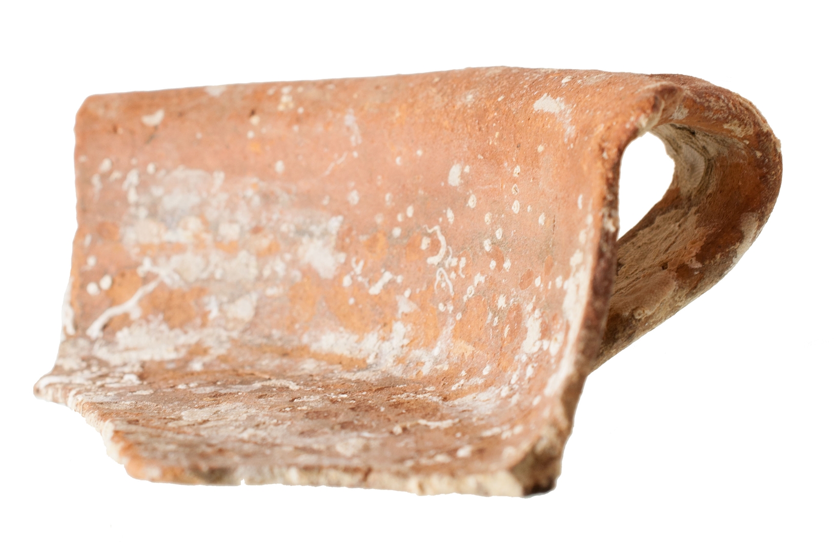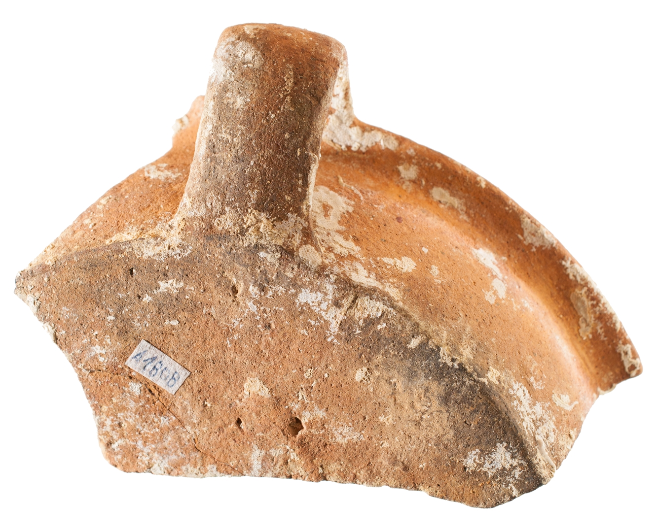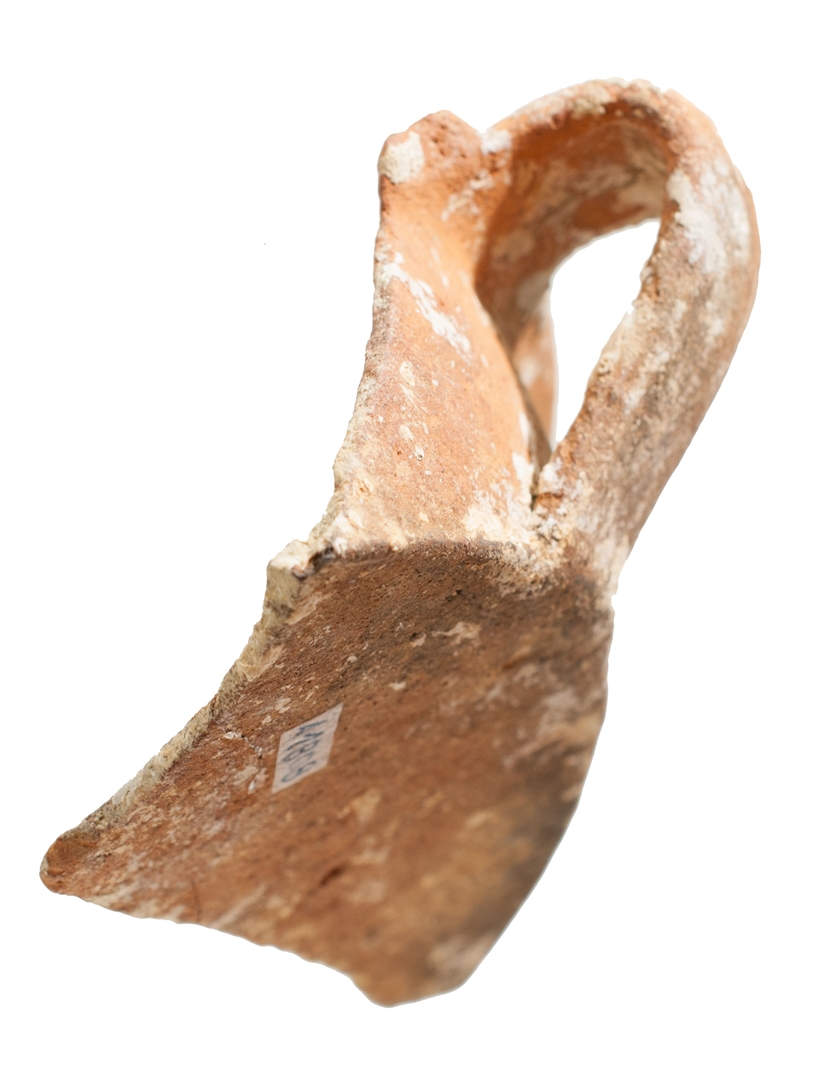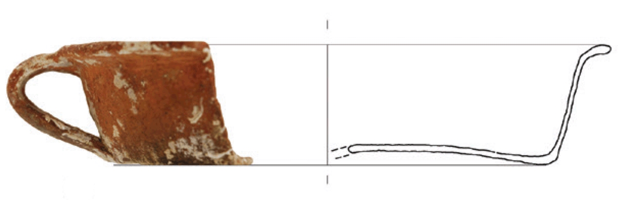 Ulomak tave s izvijenim obodom i ravnim dnom. Trakasta ručka od oboda do dna posude. Invetriata. Izrađena je od crvene, dobro pročišćene gline, prozirna glazura samo s unutarnje strane.