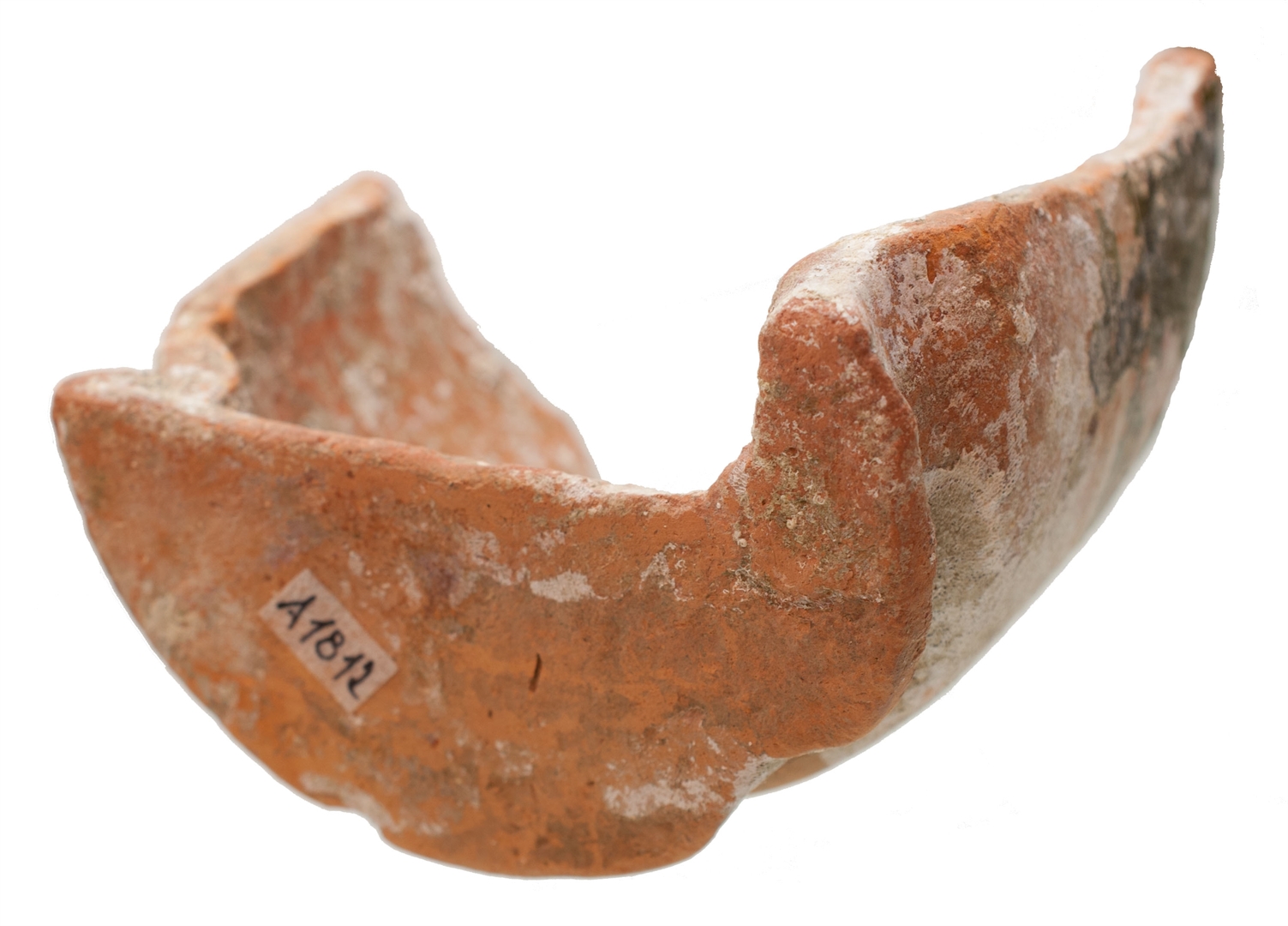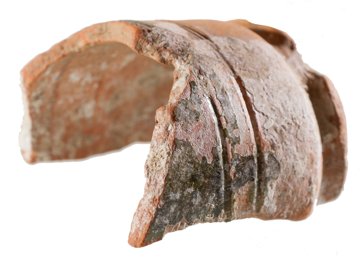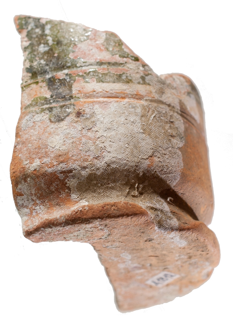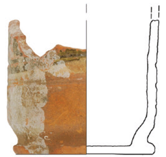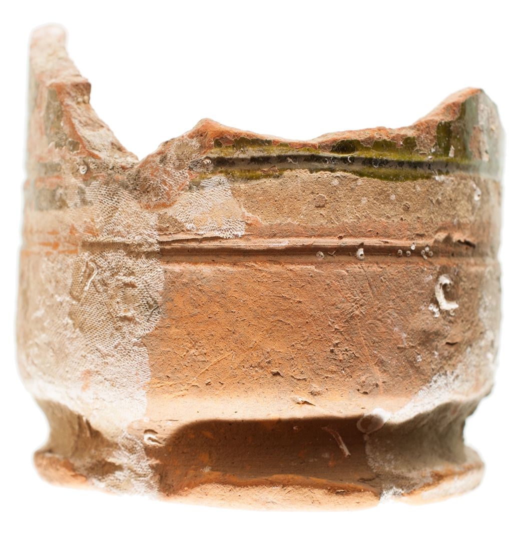 Ulomak albarela s cilindričnim tijelom i ravnom stopom. Izrađen je od crvenea, dobro pročišćene gline. Engoba sa zelenom glazurom na vanjskoj strani, a prozirna glazura na unutarnjoj strani. Izvana horizontalne urezane linije. Engobirana oslikana keramika.