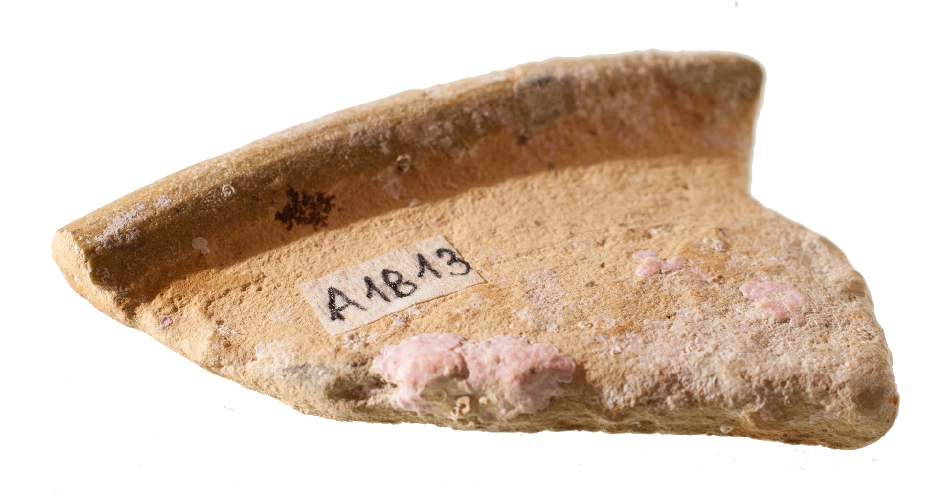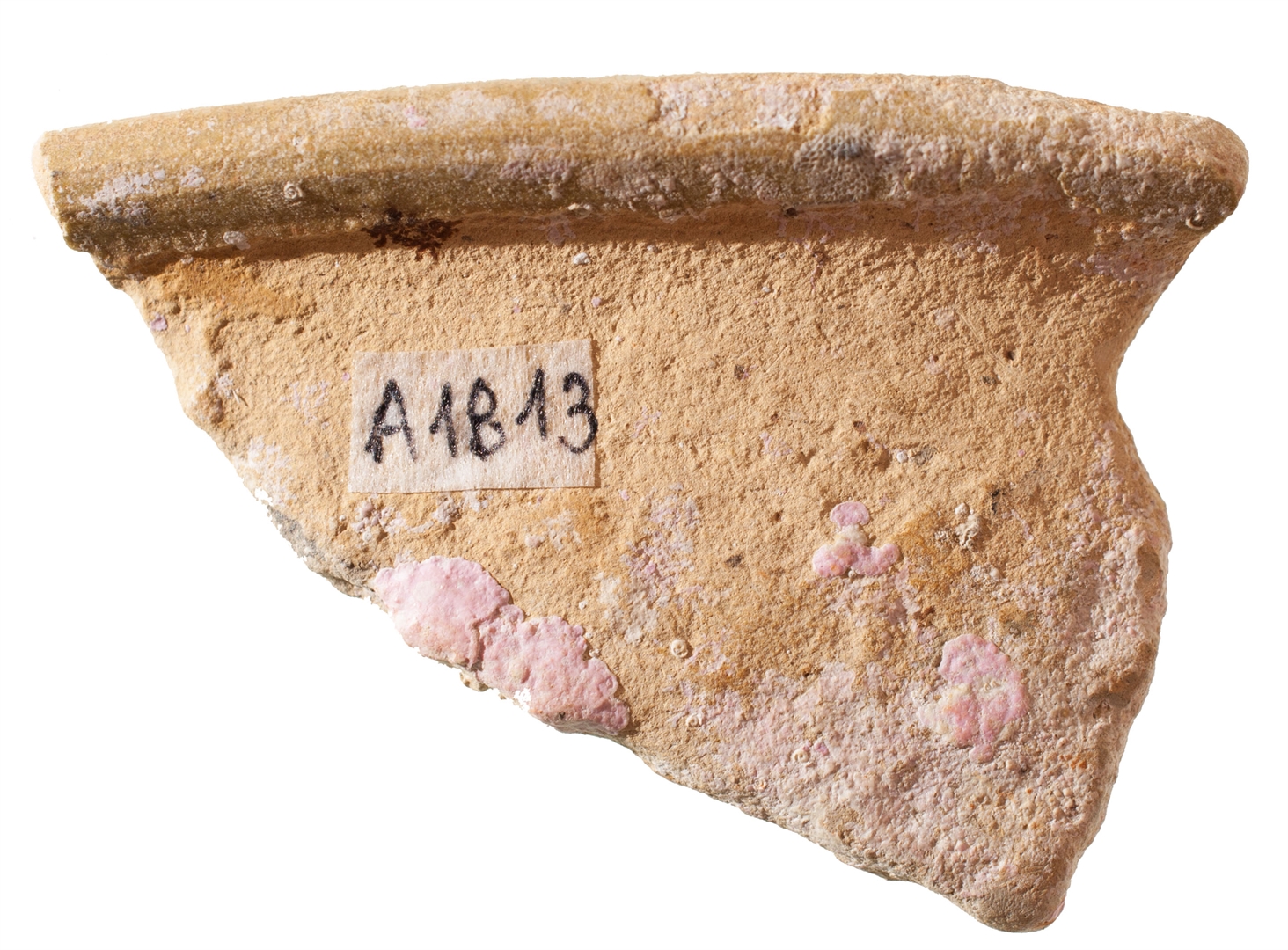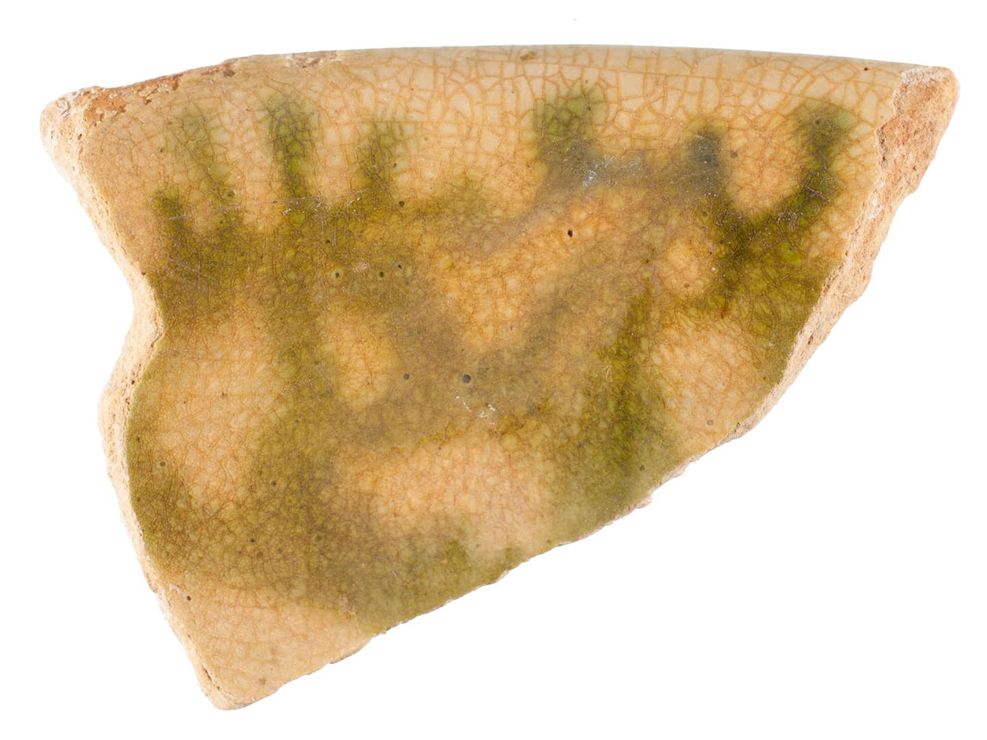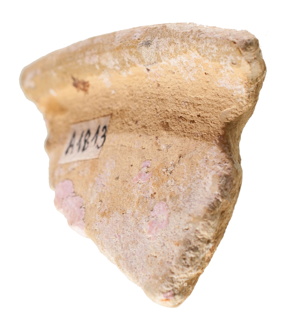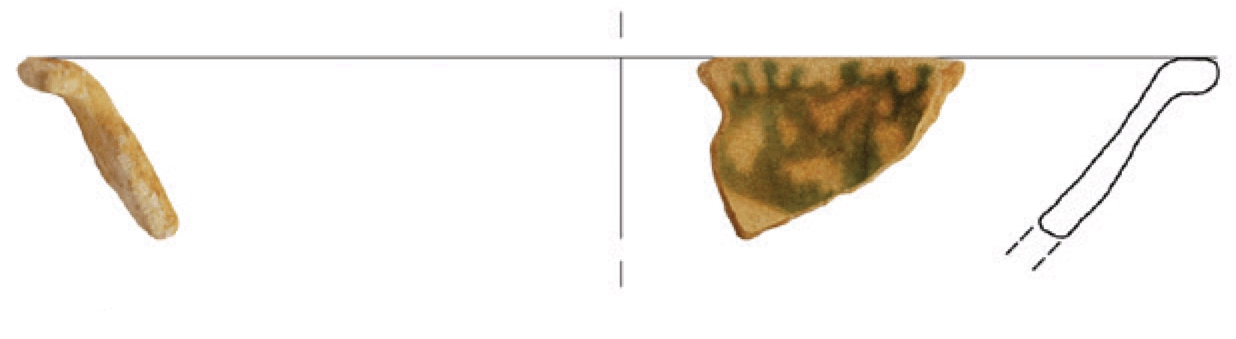 Ulomak zdjele sa izvijenim obodom. Izrađena je od svijetlo crvene, dobro pročišćene gline. Engoba i prozirna glazura samo na unutarnjoj strani. Ukras predstavljaju mrlje zelene boje izvedene oslikavanjem. Engobirana oslikana keramika.