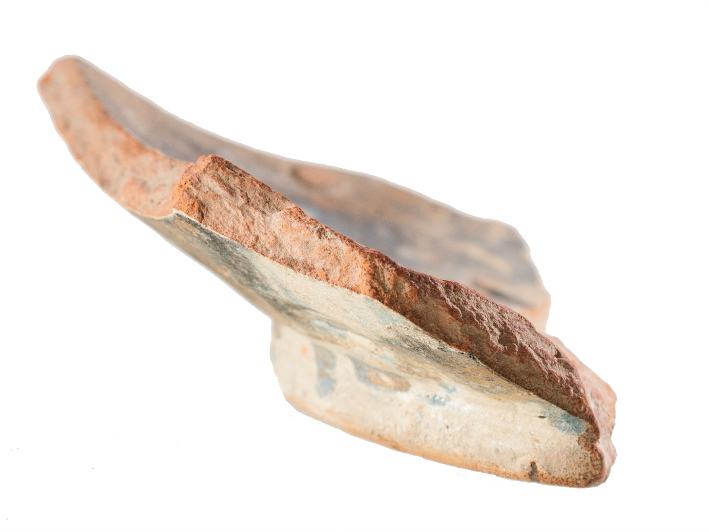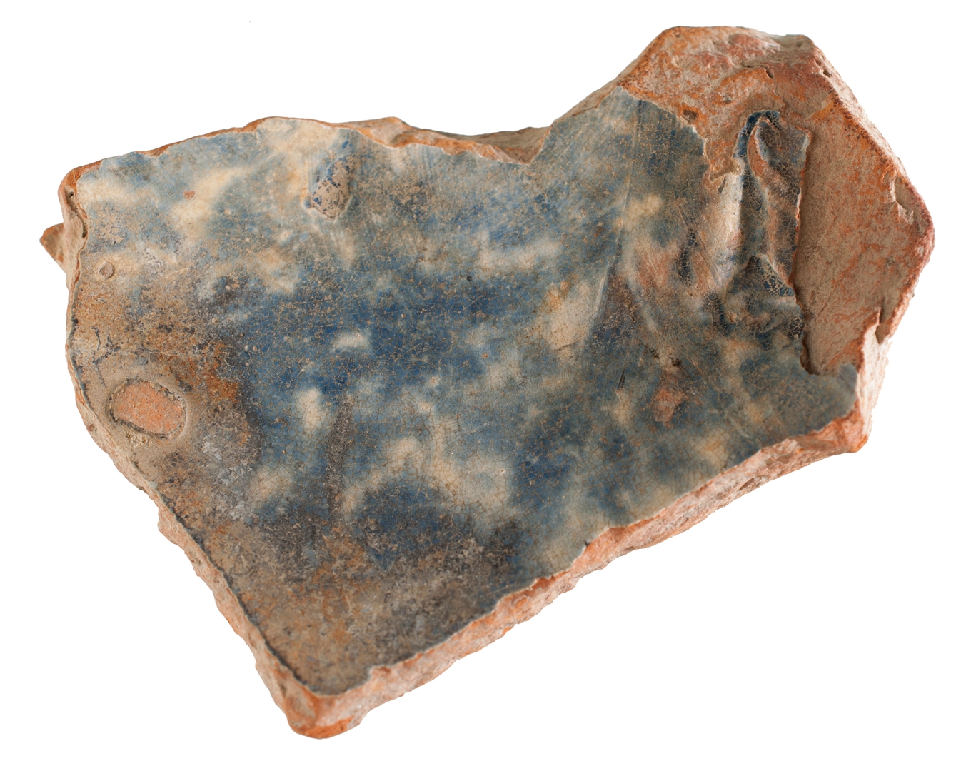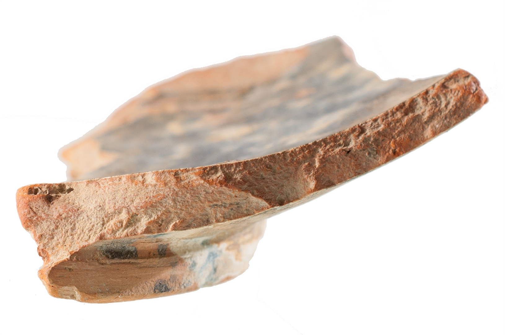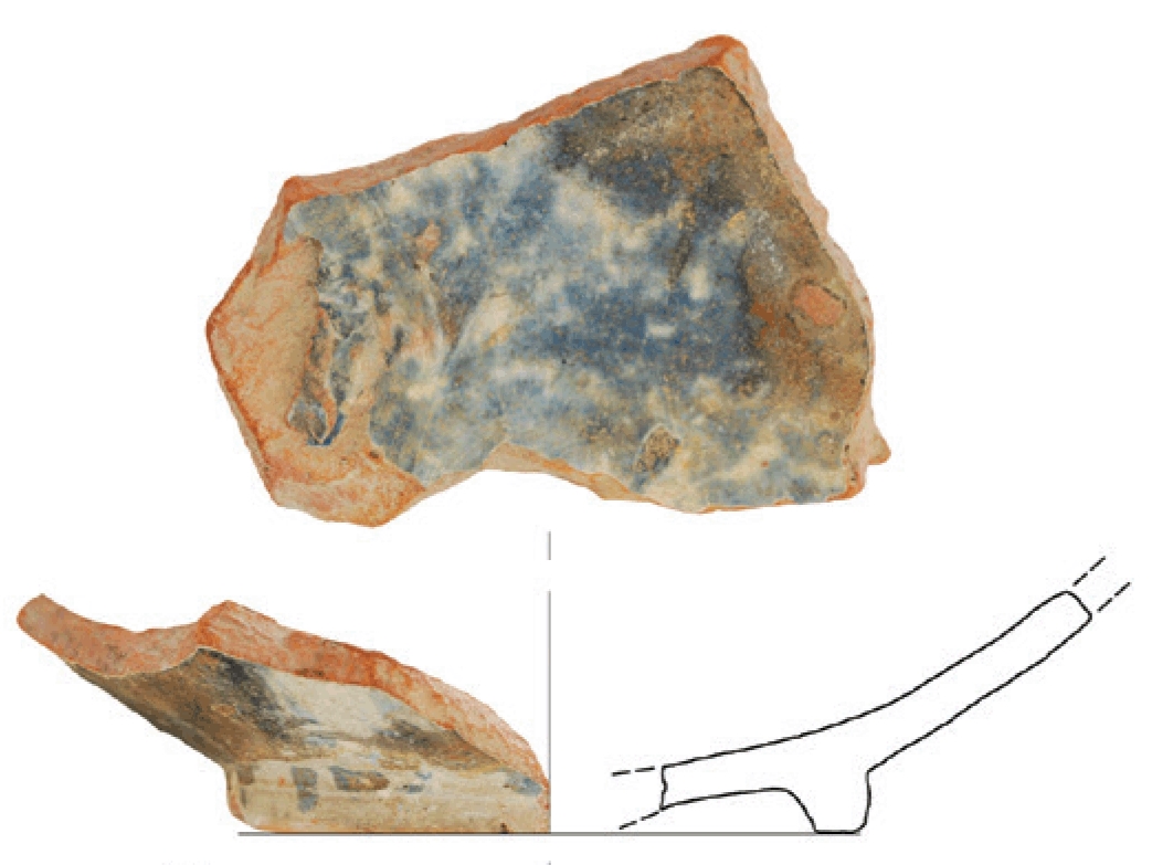 Ulomak zdjele na prstenastoj nozi izrađene od crvene, dobro pročišćene gline. Engoba i prozirna glazura na vanjskoj i unutarnjoj strani. Ukras plavih mrlja na unutarnjoj i vanjskoj strani. Engobirana oslikana keramika. Iznutra je vidljiv trepiedi otisak.