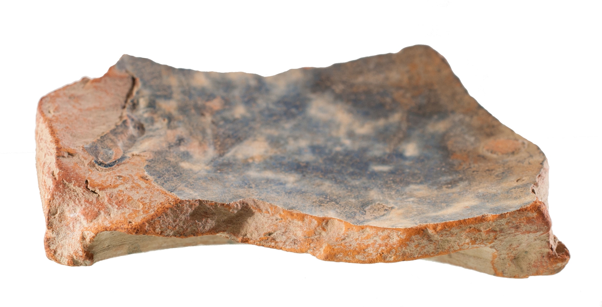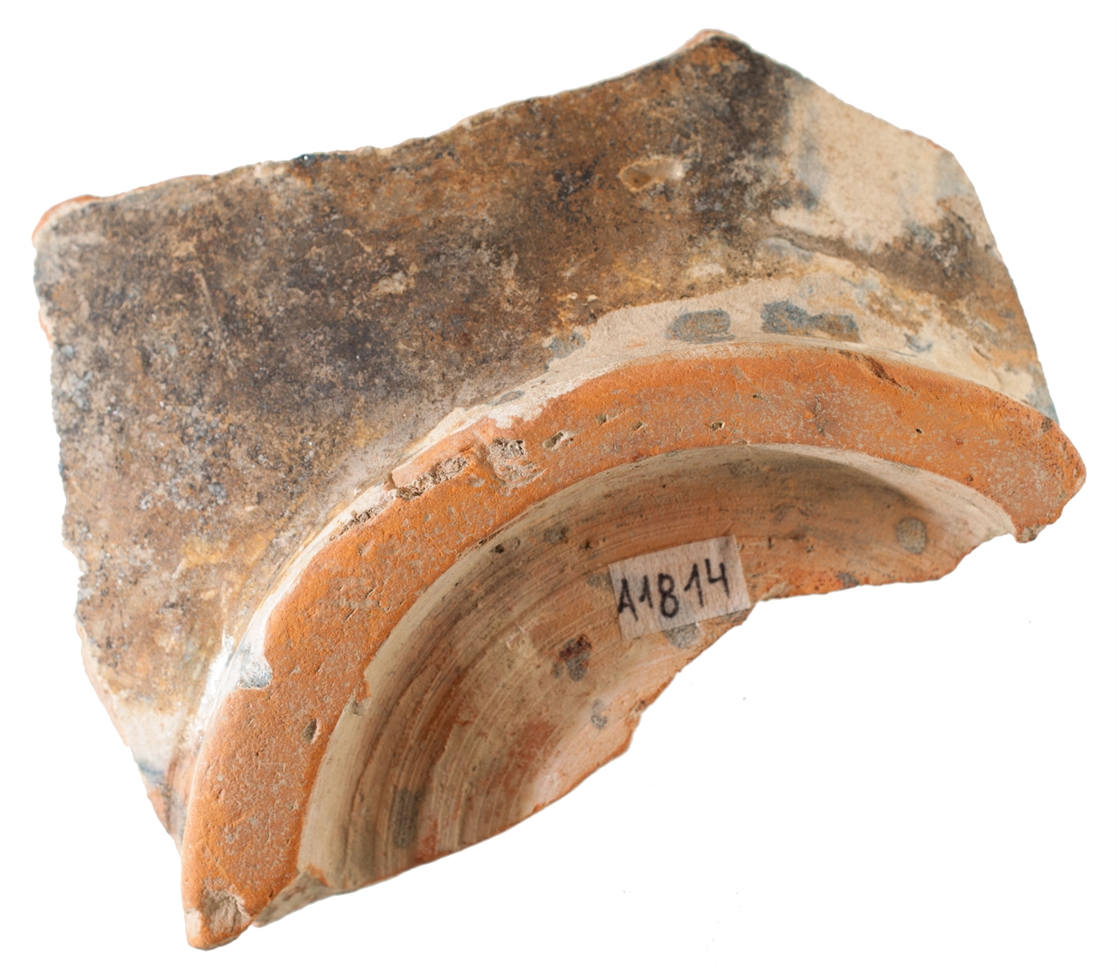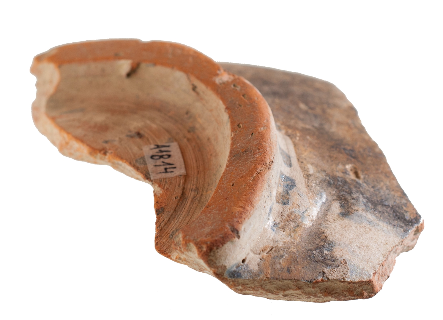 Ulomak zdjele na prstenastoj nozi izrađene od crvene, dobro pročišćene gline. Engoba i prozirna glazura na vanjskoj i unutarnjoj strani. Ukras plavih mrlja na unutarnjoj i vanjskoj strani. Engobirana oslikana keramika. Iznutra je vidljiv trepiedi otisak.