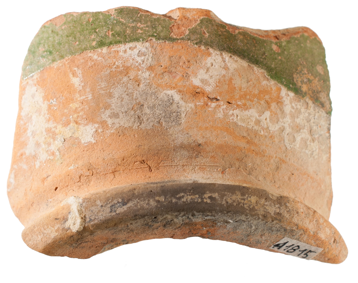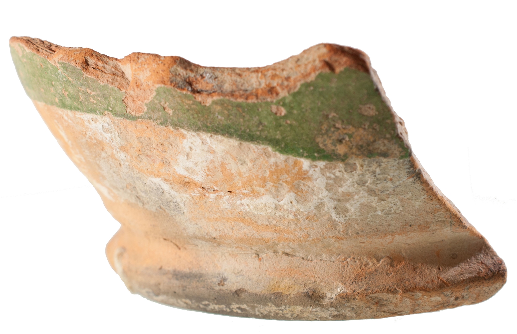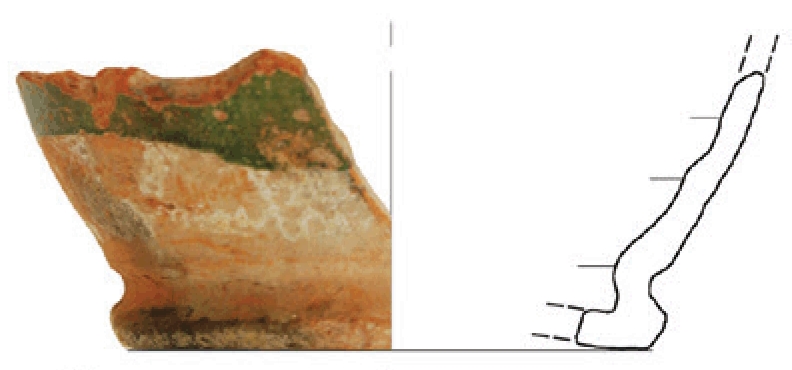 Ulomak vrča s ravnom stopom izrađen od crvene, dobro pročišćene gline. Engoba sa zelenom glazurom na vanjskoj strani, a prozirna glazura na unutarnjoj strani. Engobirana oslikana keramika.