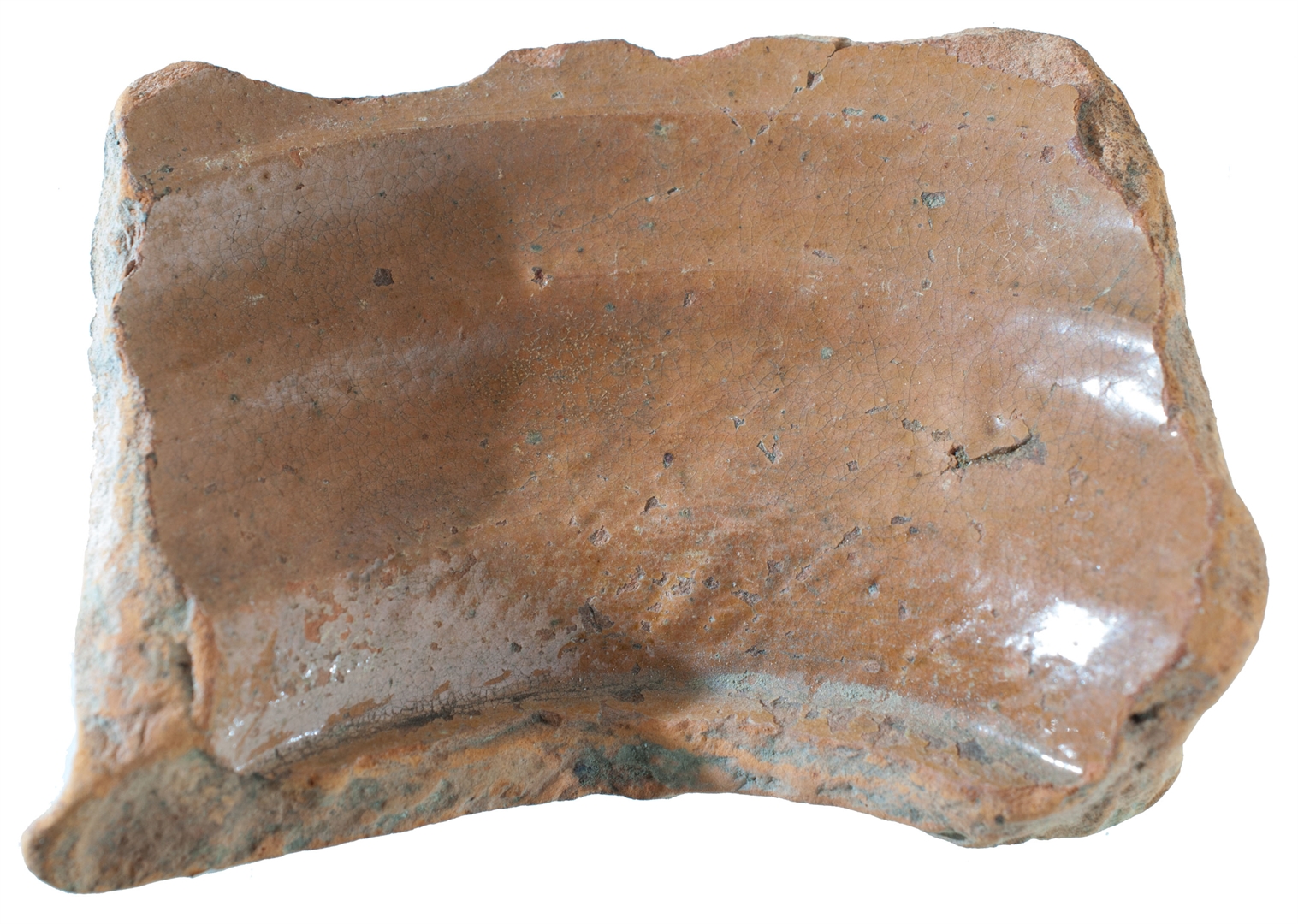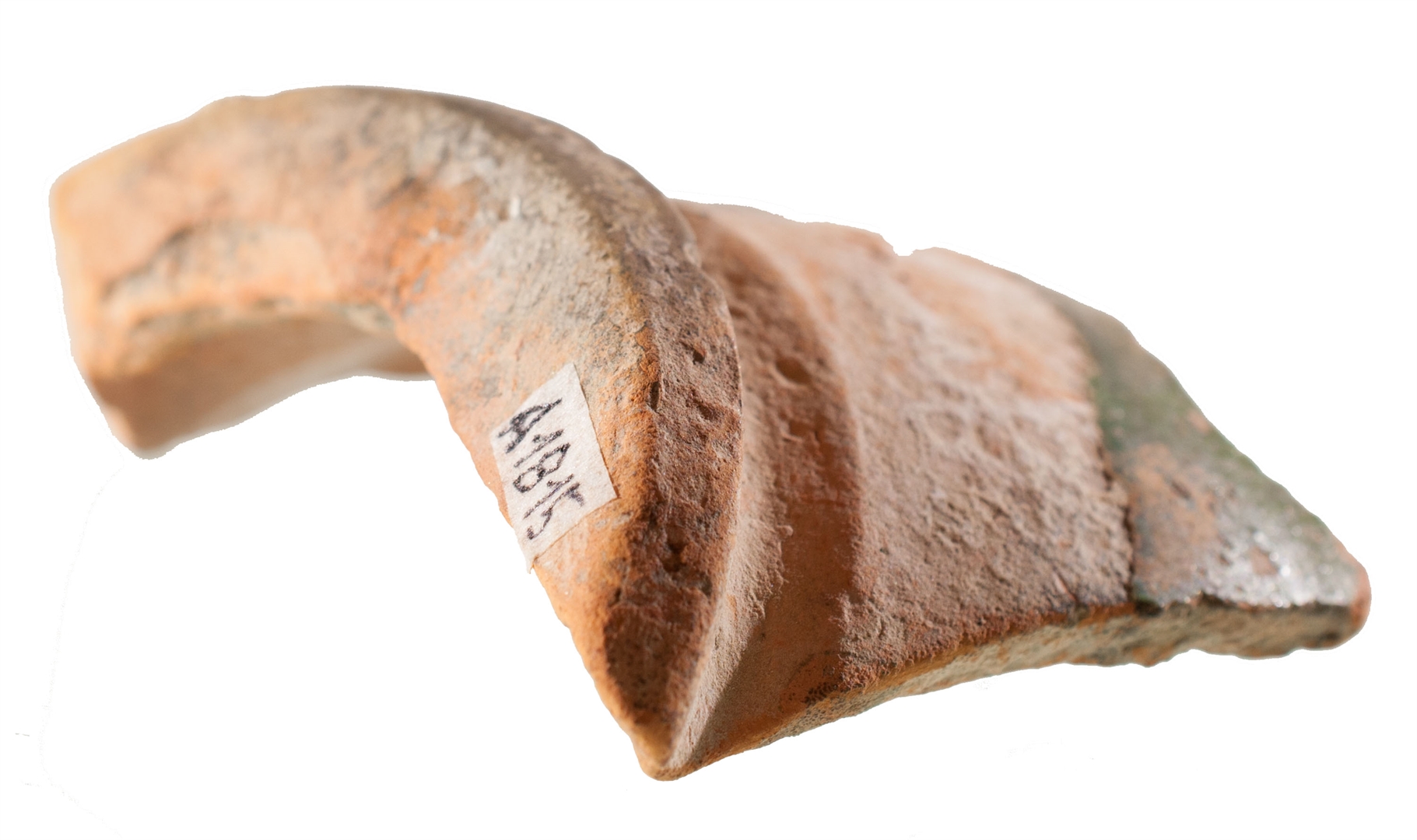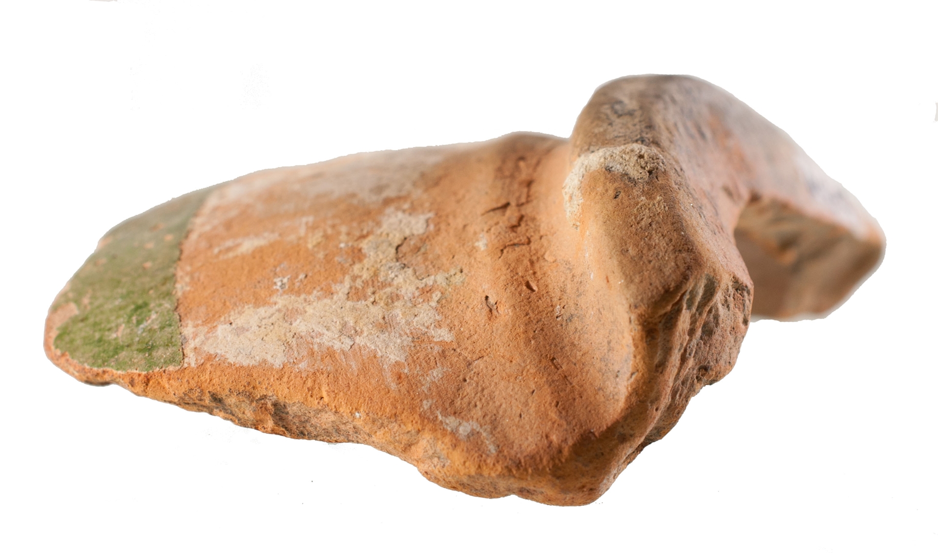 Ulomak vrča s ravnom stopom izrađen od crvene, dobro pročišćene gline. Engoba sa zelenom glazurom na vanjskoj strani, a prozirna glazura na unutarnjoj strani. Engobirana oslikana keramika.