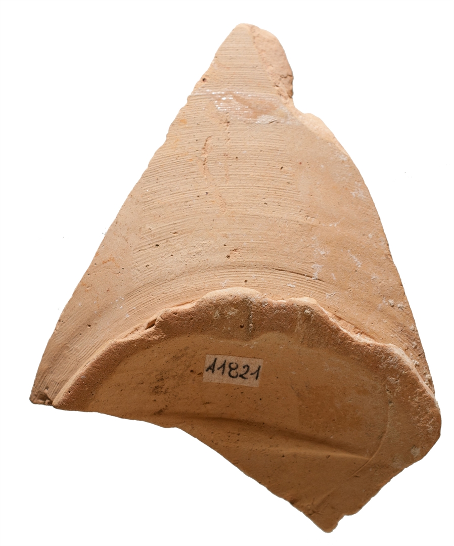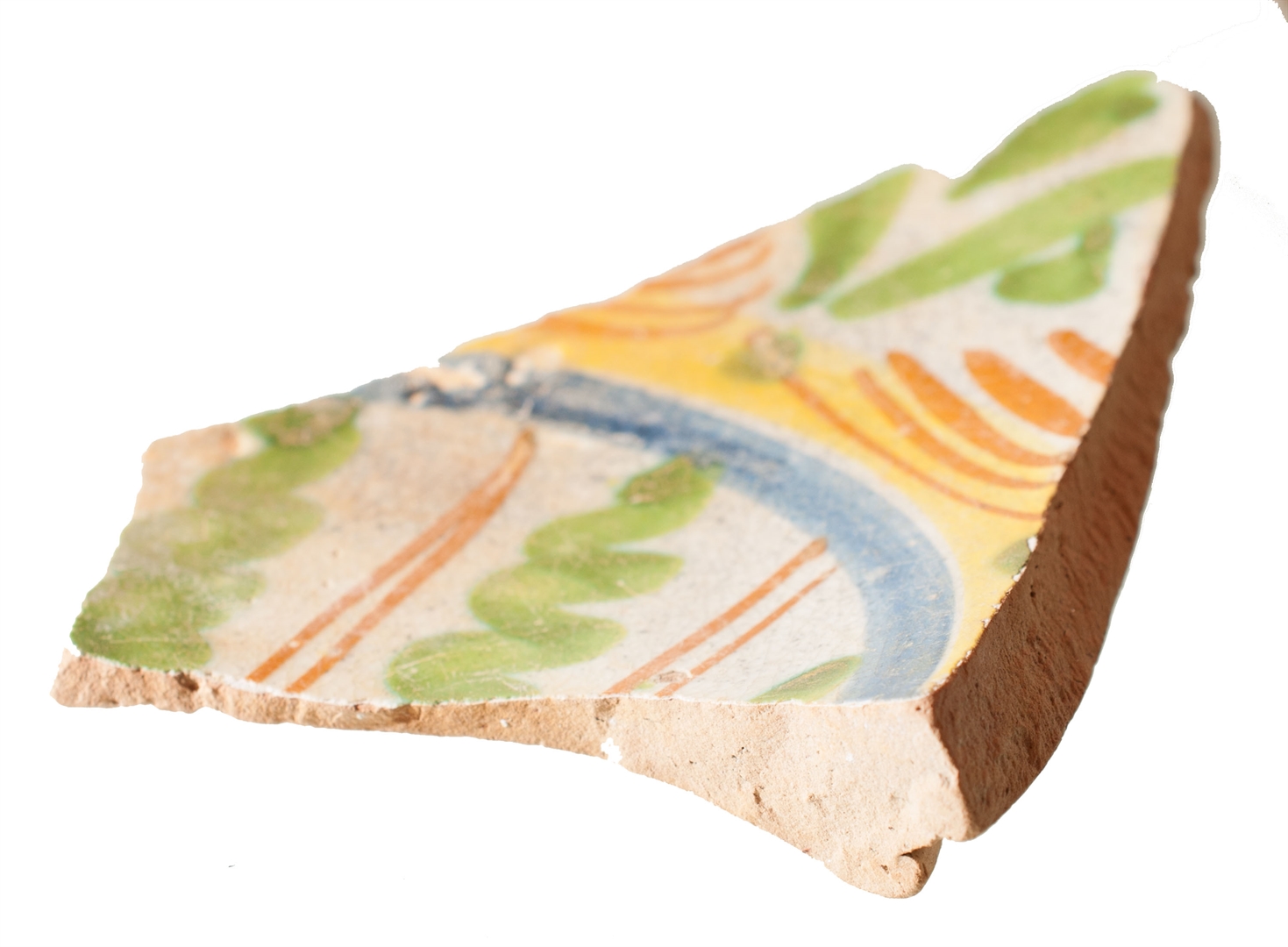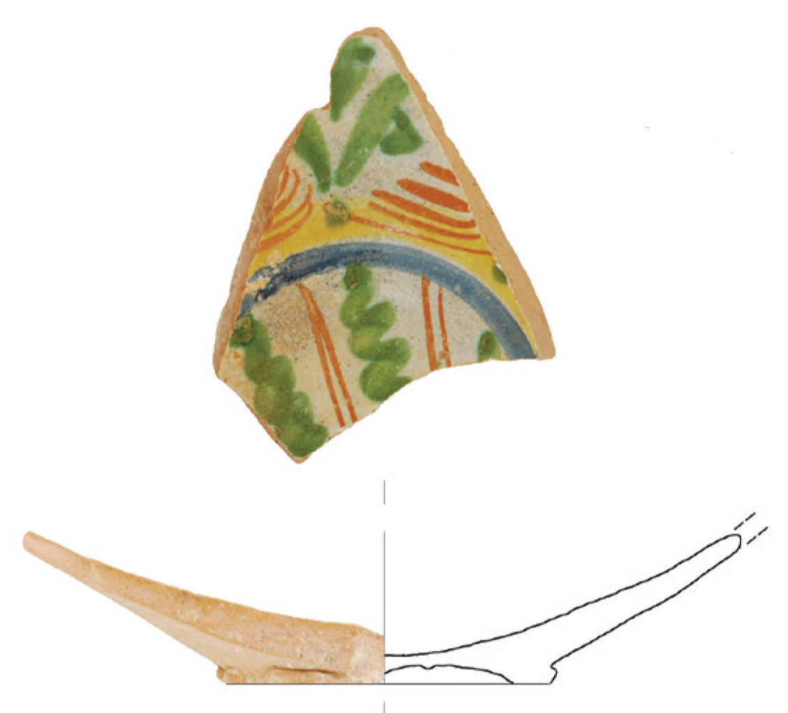 Ulomak dna tanjura na prstenastoj nožici. Izrađen je od crvene, dobro pročišćene gline. Glazura je samo na unutarnjoj strani. Ukras je isto samo na unutarnjoj strani, izveden oslikavanjem vegetabilnih i geometrijskih motiva zelene, oker, narančaste i plave boje. Majolika.
