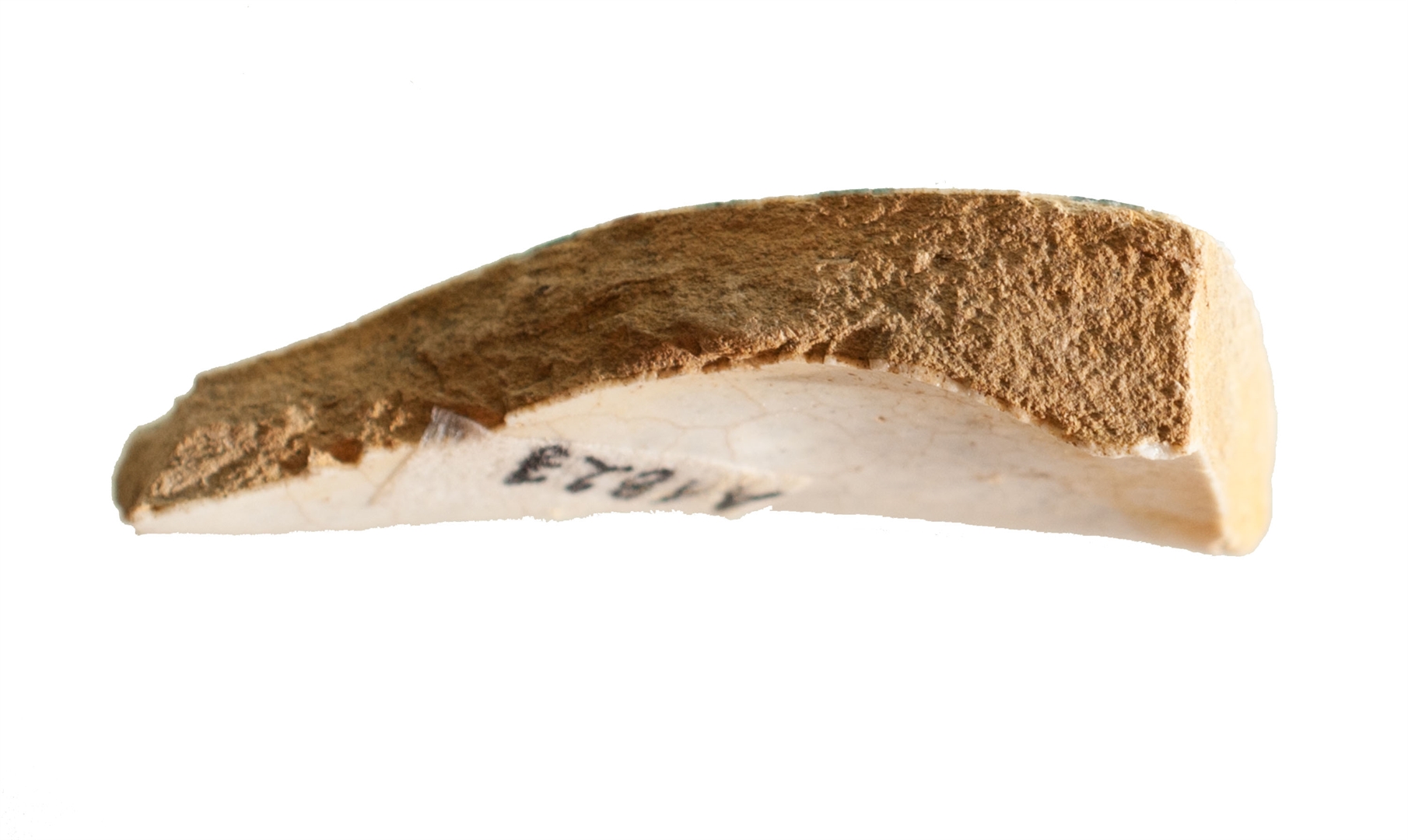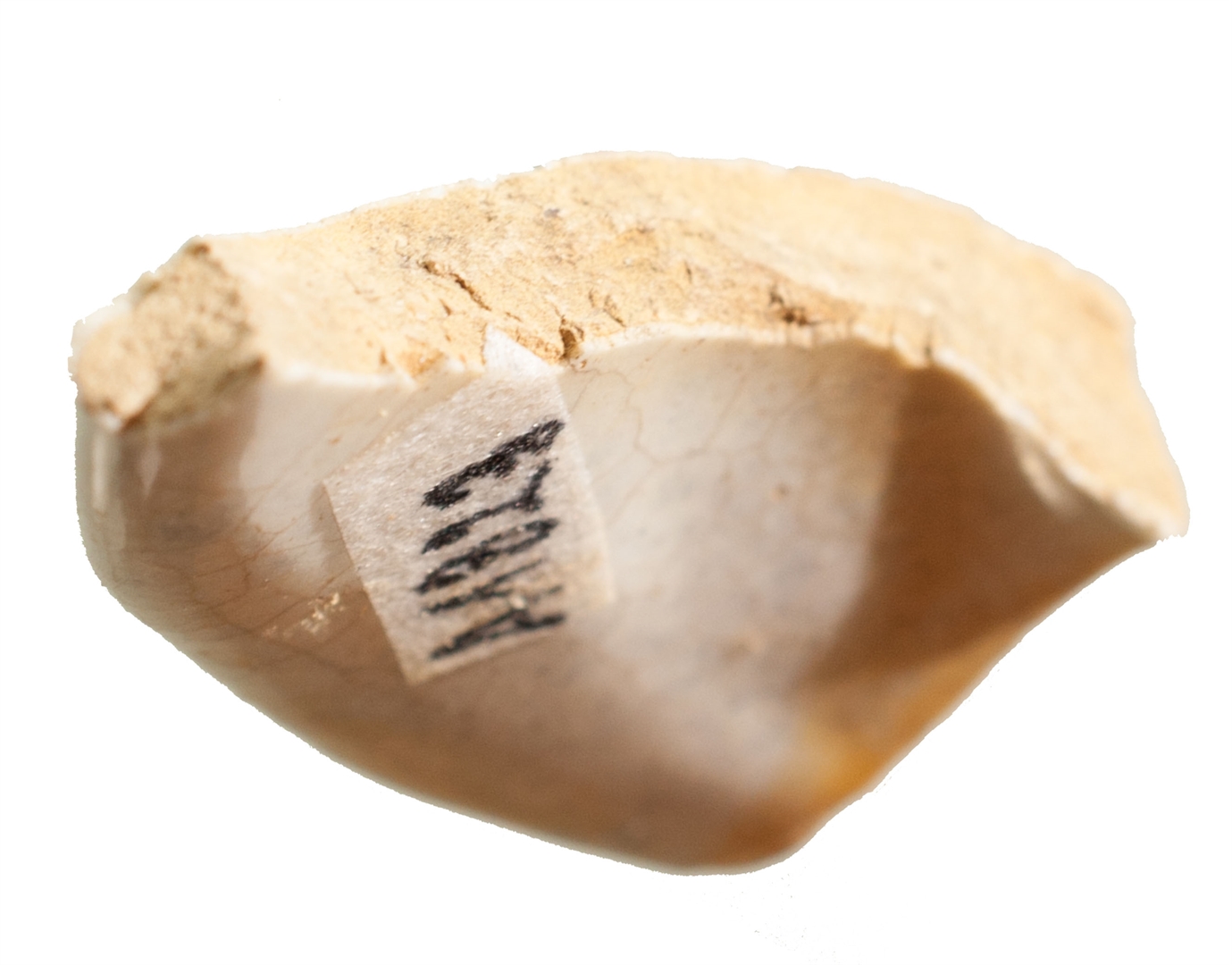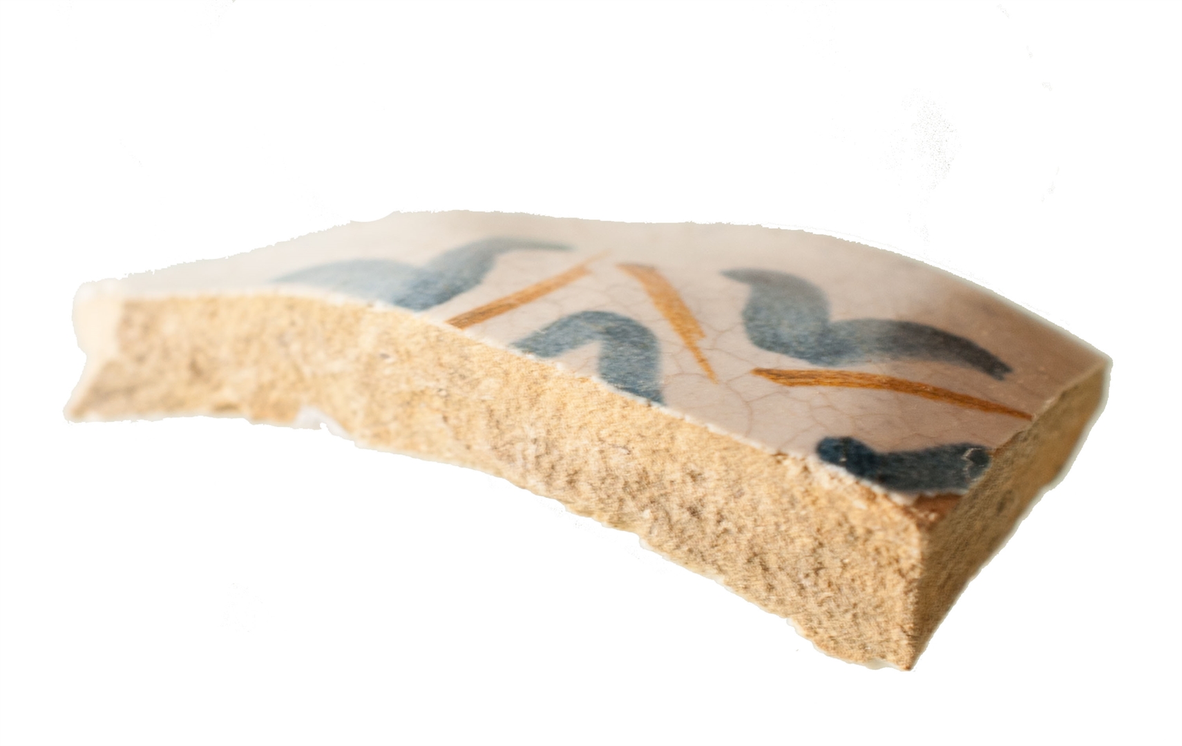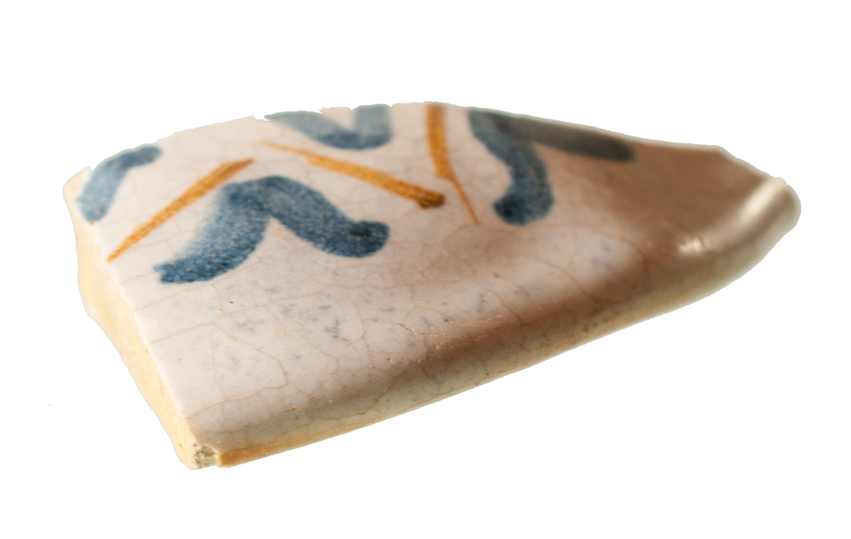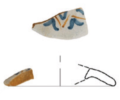 Ulomak poklopca izrađenog od svijetlo narančaste, dobro pročišćene gline. Glazura s obje strane, ukras vegetabilnih motiva izveden oslikavanjem plavom i smeđom bojom samo na vanjskoj strani. Majolika.
