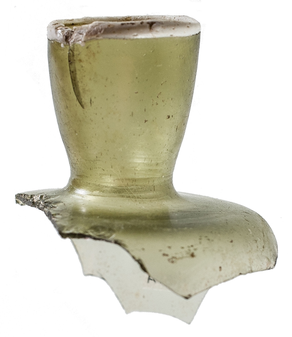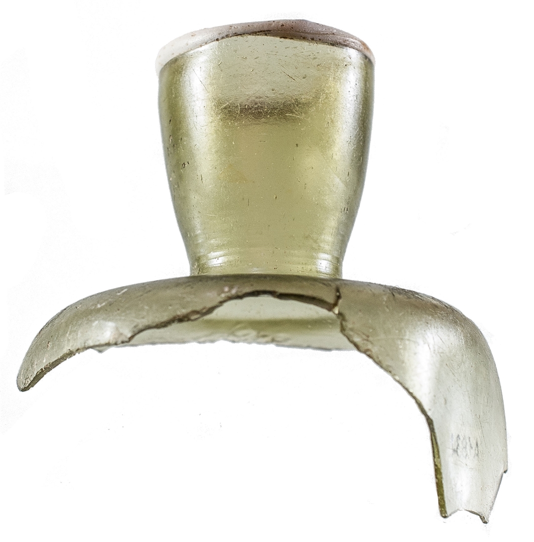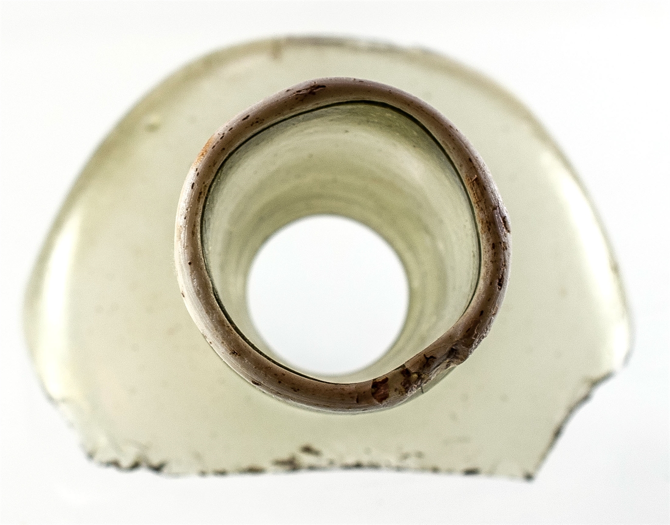 Gornji dio maslinastozelene boce s čunjastim grlom i bijelim obrubom oboda.