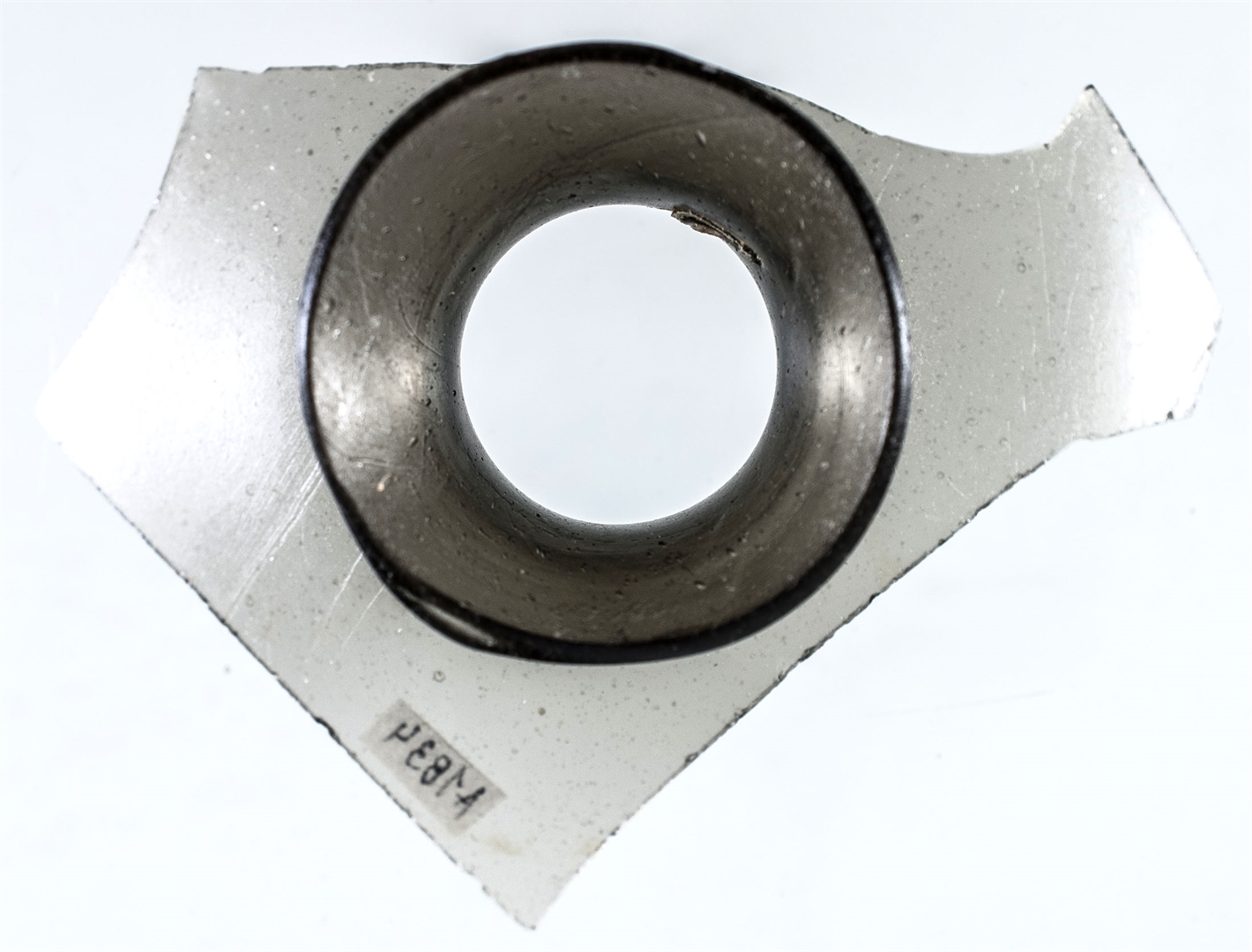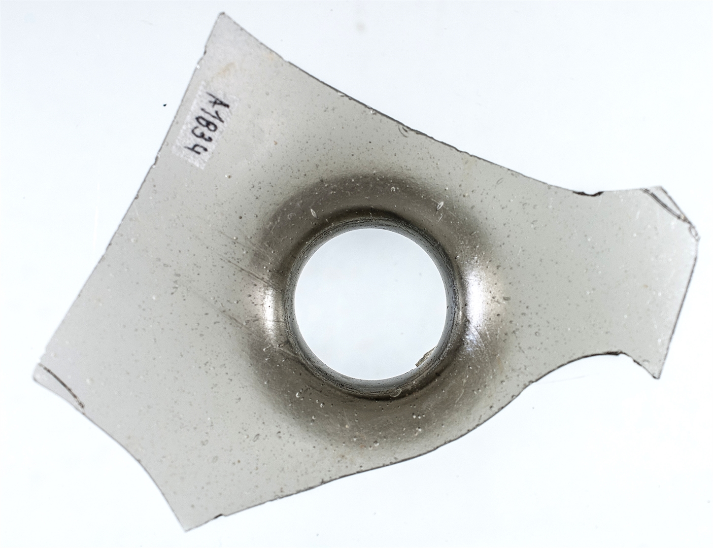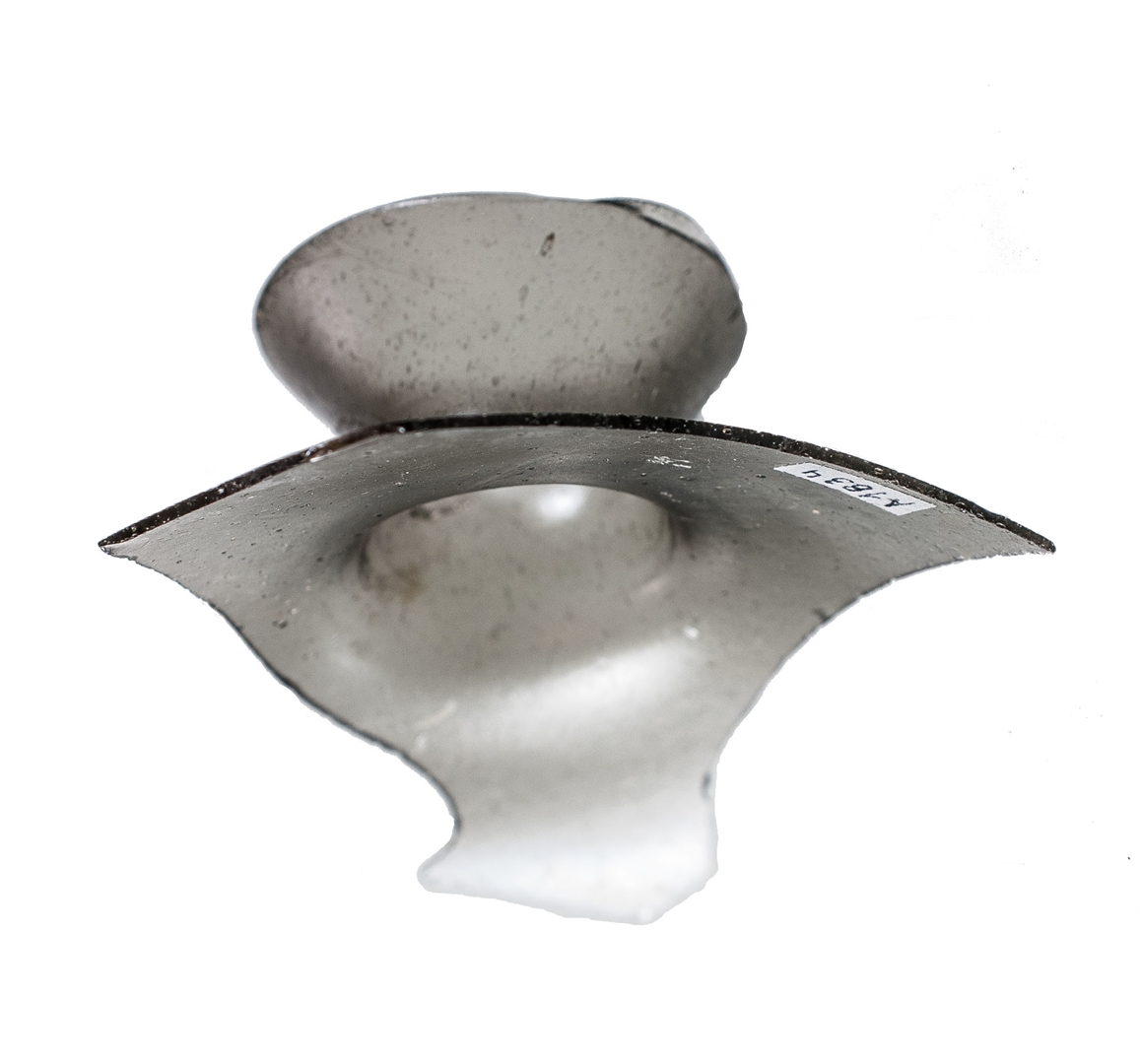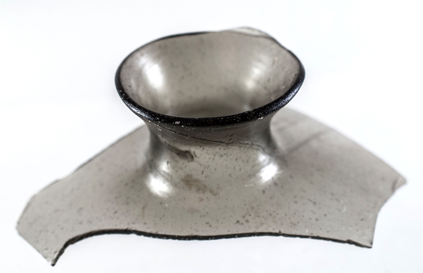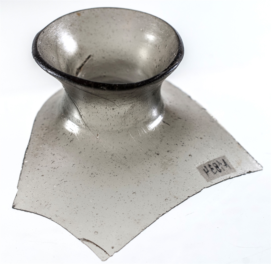 Gornji dio tamnosmećkaste boce s ljevkastim grlom.