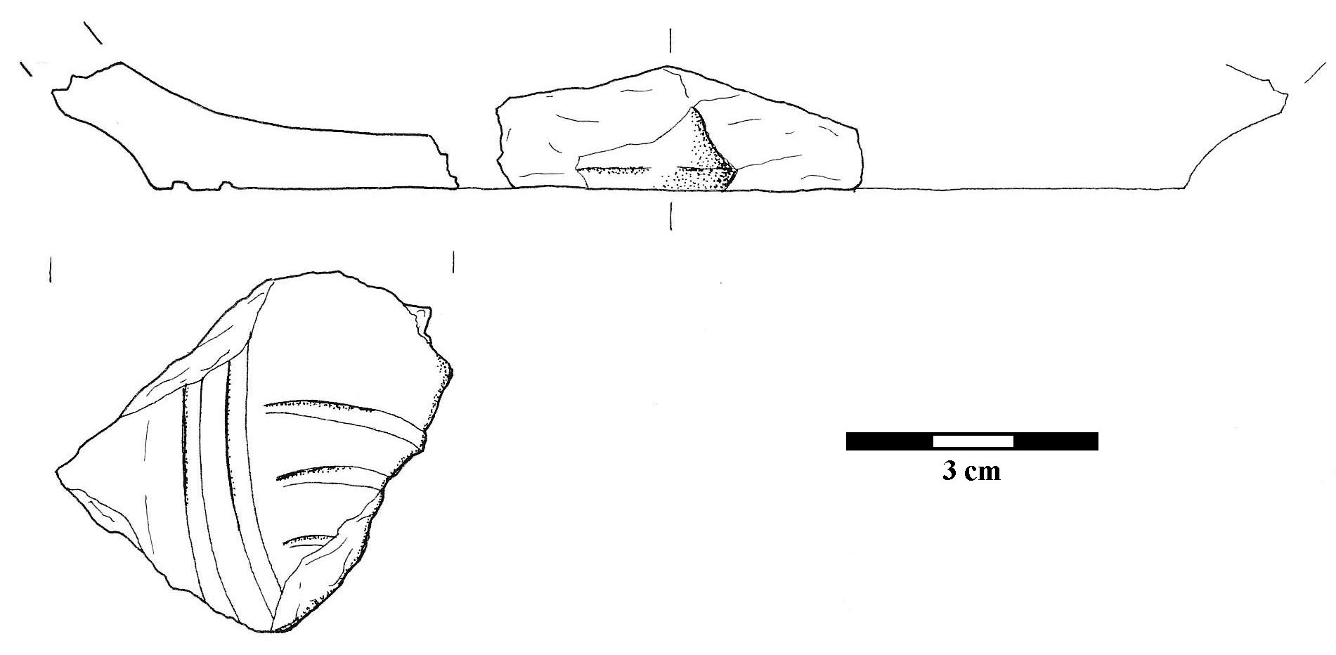 Ulomak ravnog dna posude ukrašen snopovima kanelura. Keramika je sivo oker boje a površine su polirane.
