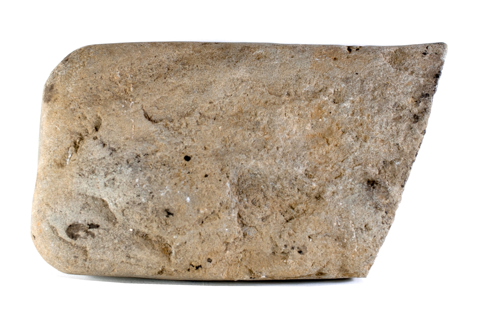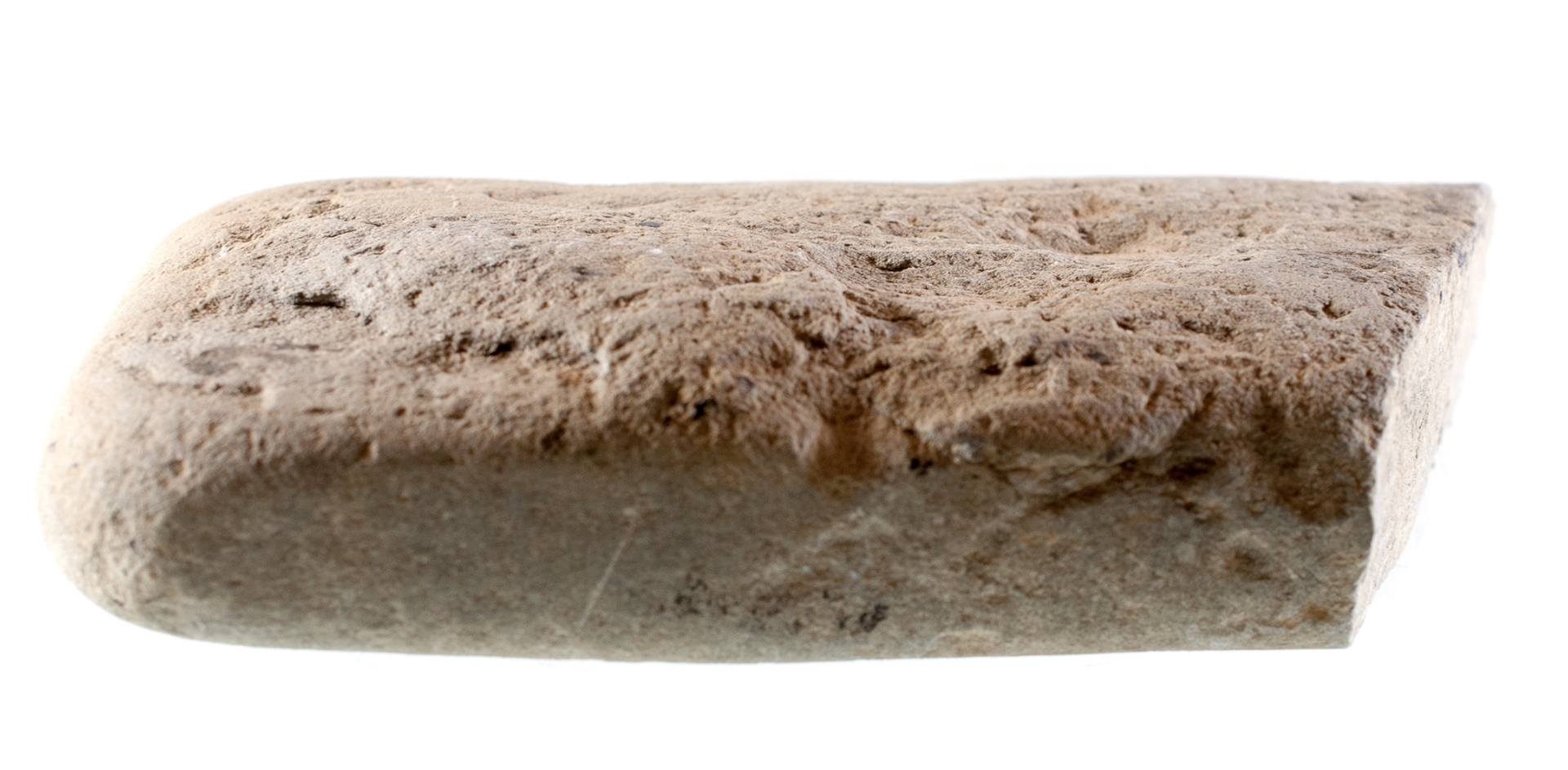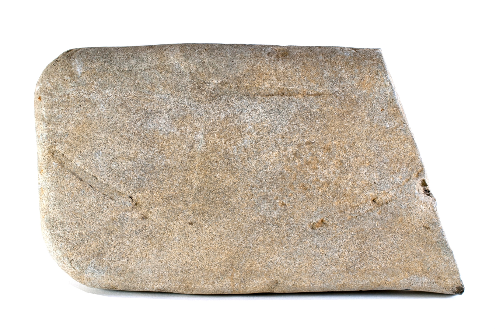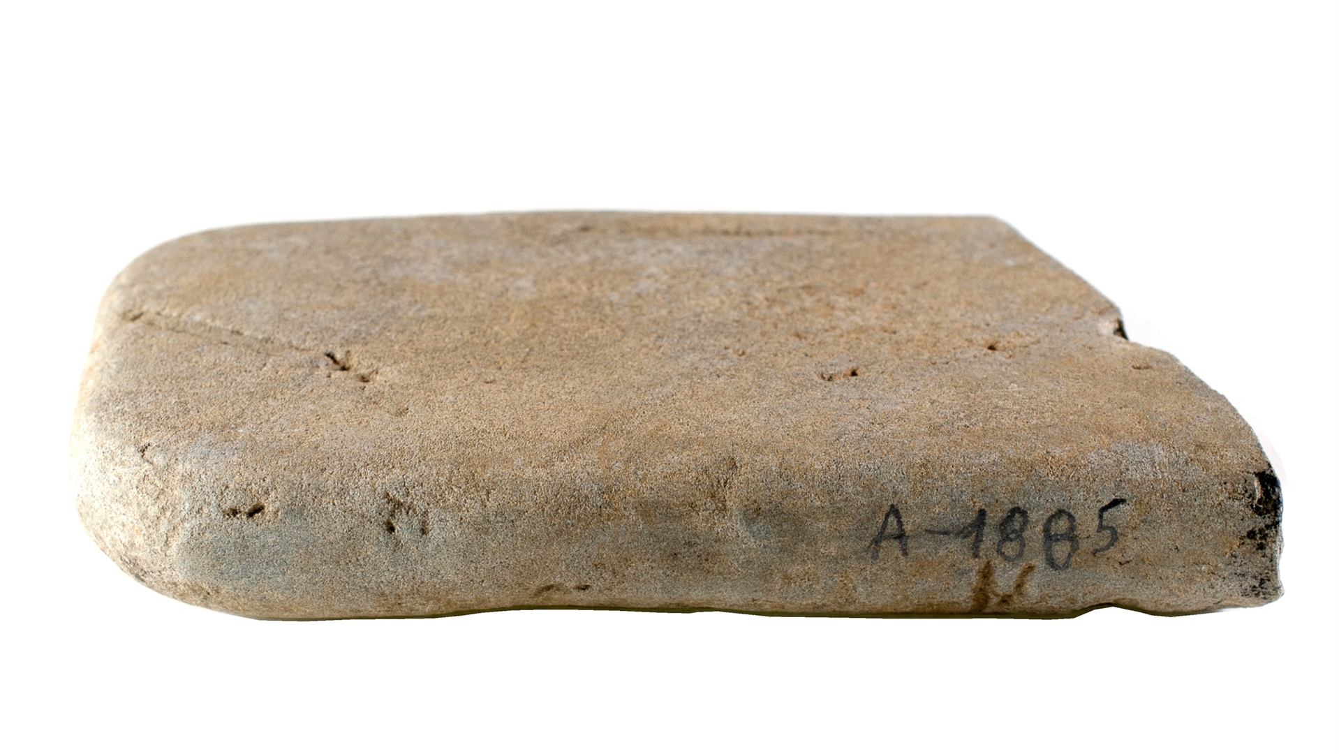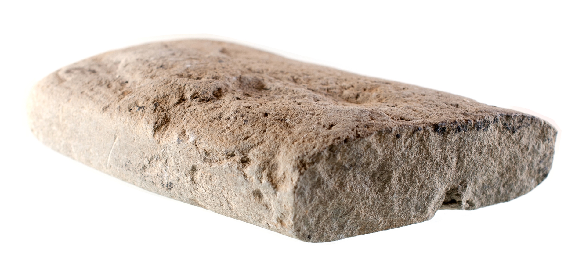 Kameni brus izrađen od sivkastog pješčenjaka. Tragovi korištenja sa bočnih i jedne veće strane.