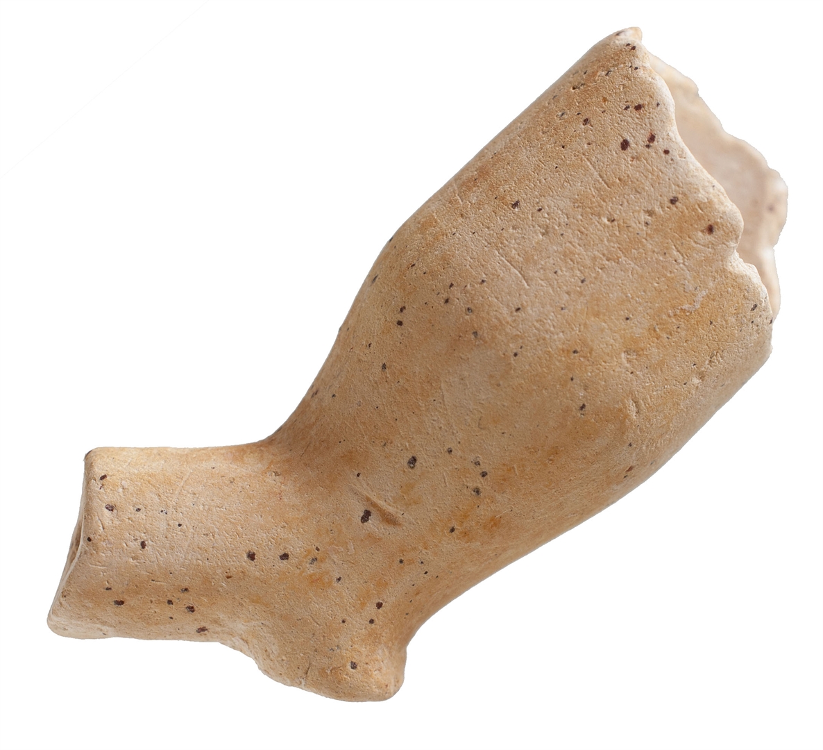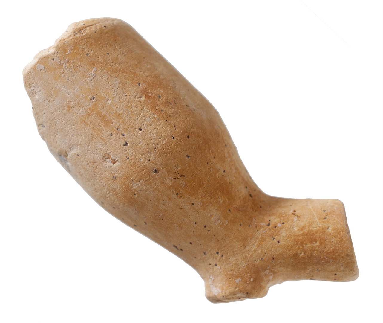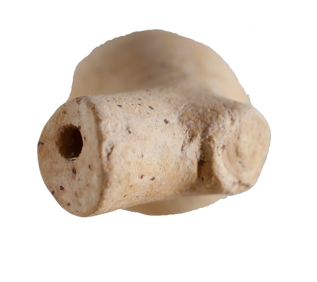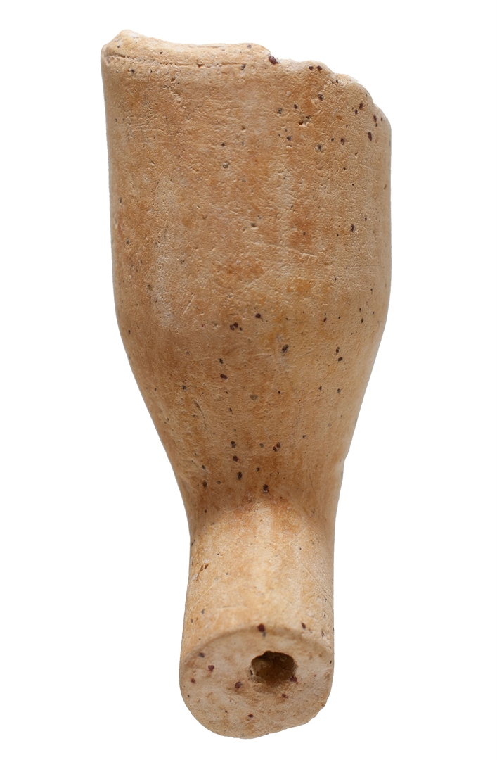 Zapadna lula bijele boje s pečatom guske koja stoji nadesno i krunom iznad nje?. Visina lule = 34 mm Dužina lule = Promjer prostora za duhan = 15 mm Unutrašnja visina prostora za duhan = 26 mm Unutrašnji promjer tuljca = ? mm