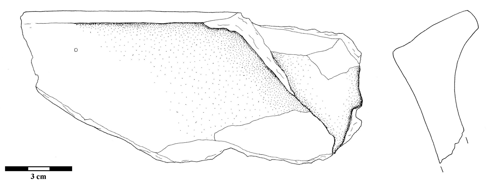 Ulomak prema van izvijenog ušća velike posude. Keramika je sa vanjske strane oker boje a sa unutrašnje strane siva.