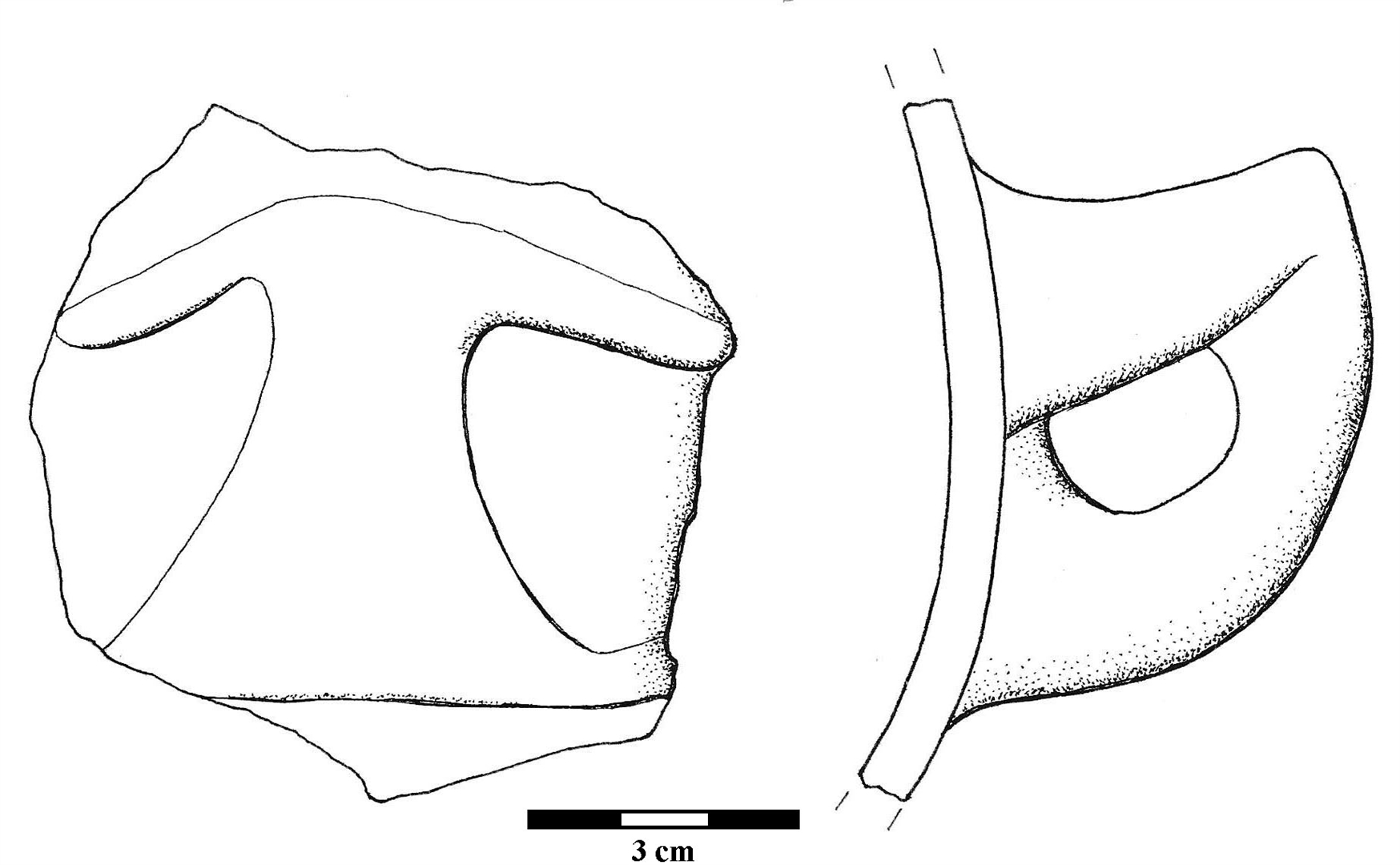 Trokutasta ručka s pločastim završetkom. Keramika je sive boje.