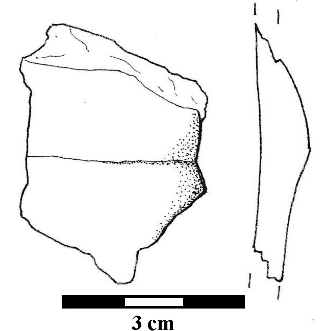 Ulomak posude ravnog dna. Keramika je tamnosive boje s primjesama kalcita.
