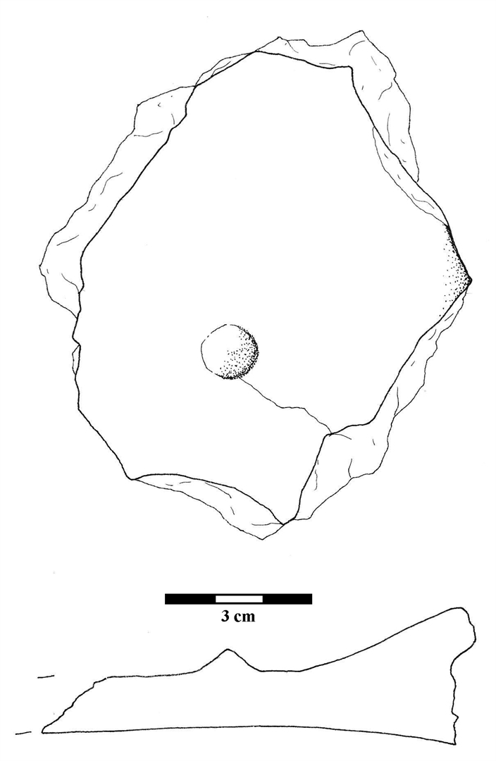 Ulomak tijela posude na čijoj se vanjskoj strani nalazi ukras u obliku bradavice.Keramika je sa vanjske strane crvene boje a s unutrašnje crne s velikim zrnima kalcita.