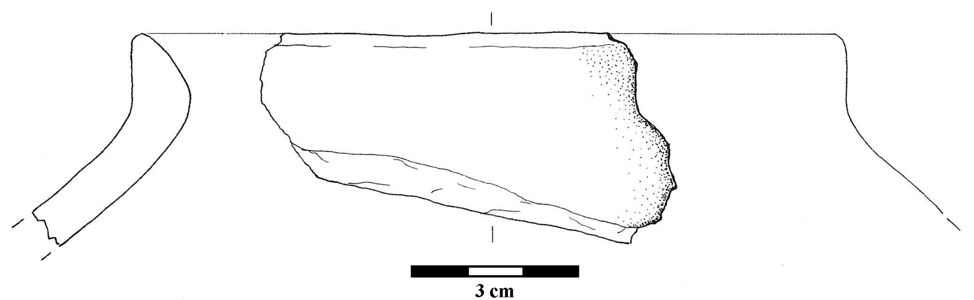 Ulomak prema van izvijenog ušća posude. Keramika je oker boje, fine fakture i polirane vanjske površine.