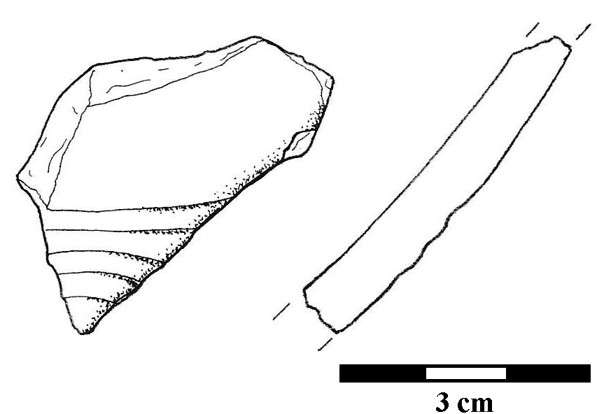 Ulomak tijela posude ukrašene dvjema plitkim kanelurama. Keramika je sivo oker boje.