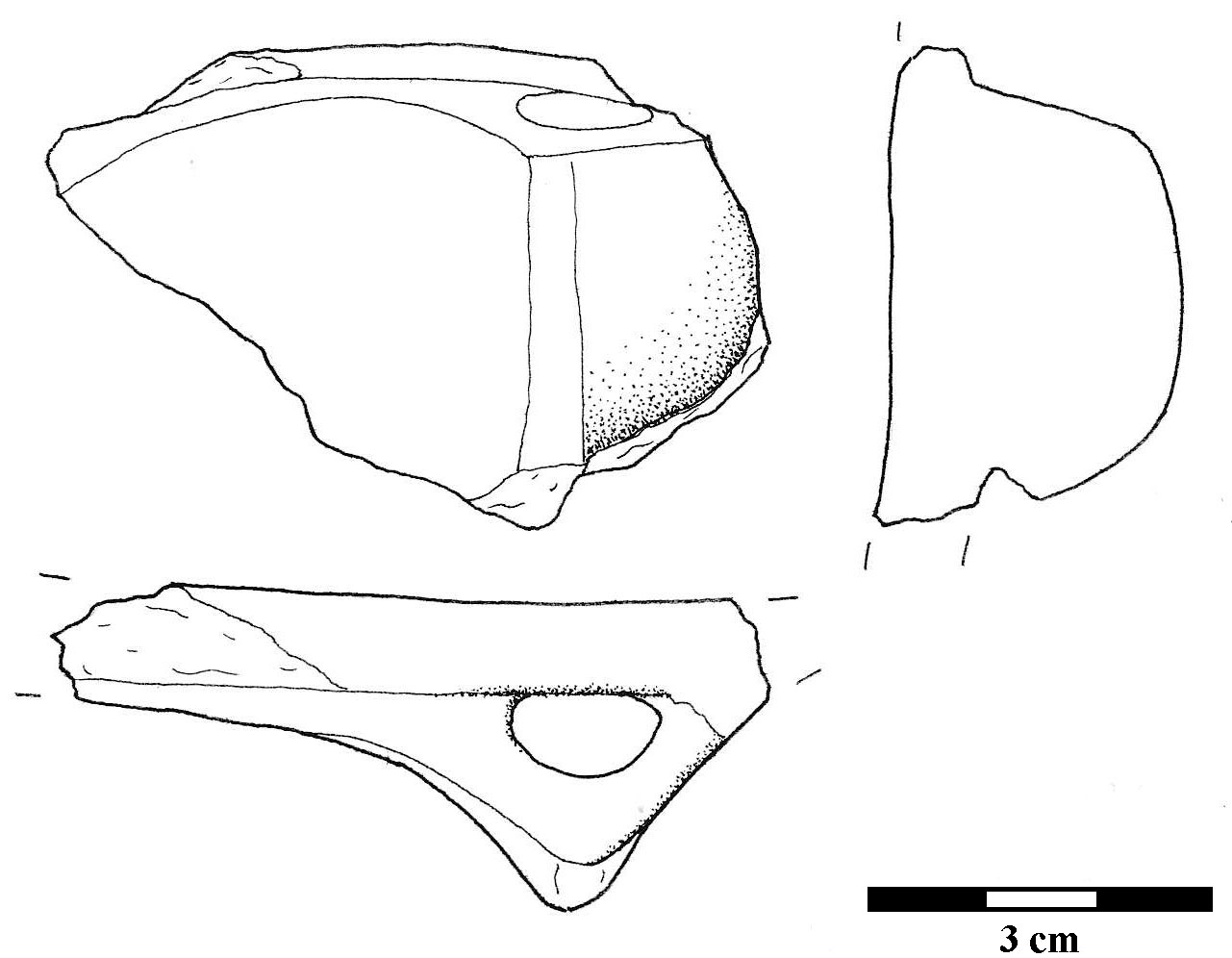 Ulomak posude ravnog ušća ispod kojeg se s vanjske strane nalazi vertikalna ručka. Keramika je sivo narančaste boje i poliranih površina.