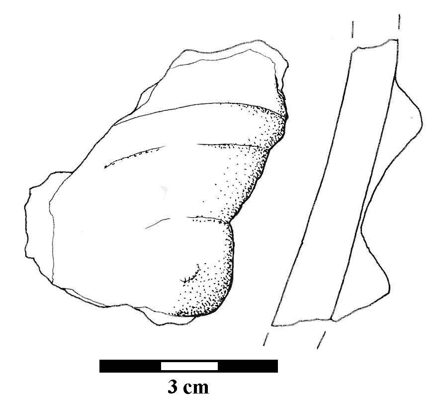 Ulomak tijela posude gdje se vide ostaci kružne aplikacije i bradavičasto ispupčenje u sredini. Keramika je narančasto sive boje grube fakture i dosta primjesa kalcita.