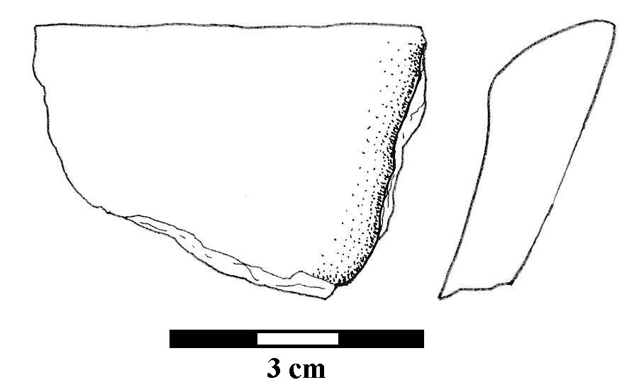 Ulomak gornjeg djela posude s prema unutra zakošenim ušćem. Keramika je sivo oker boje.