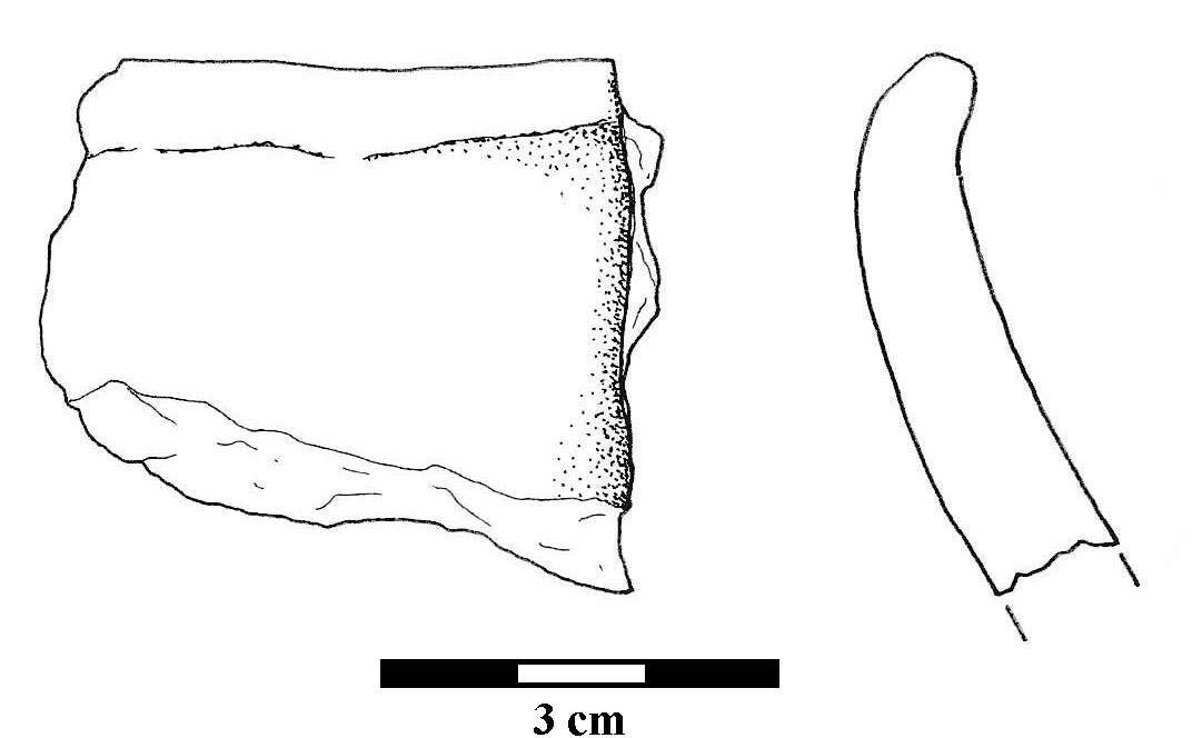 Ulomak gornjeg djela posude koja ima prema vani izvijeno ušće. Keramika je sivo narančaste boje i gribe fakture.