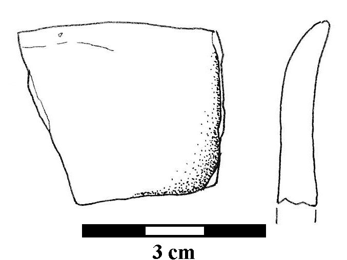 Ulomak gornjeg djela posude s blago prema vani izvijenim ušćem. Keramika je sivo oker boje.