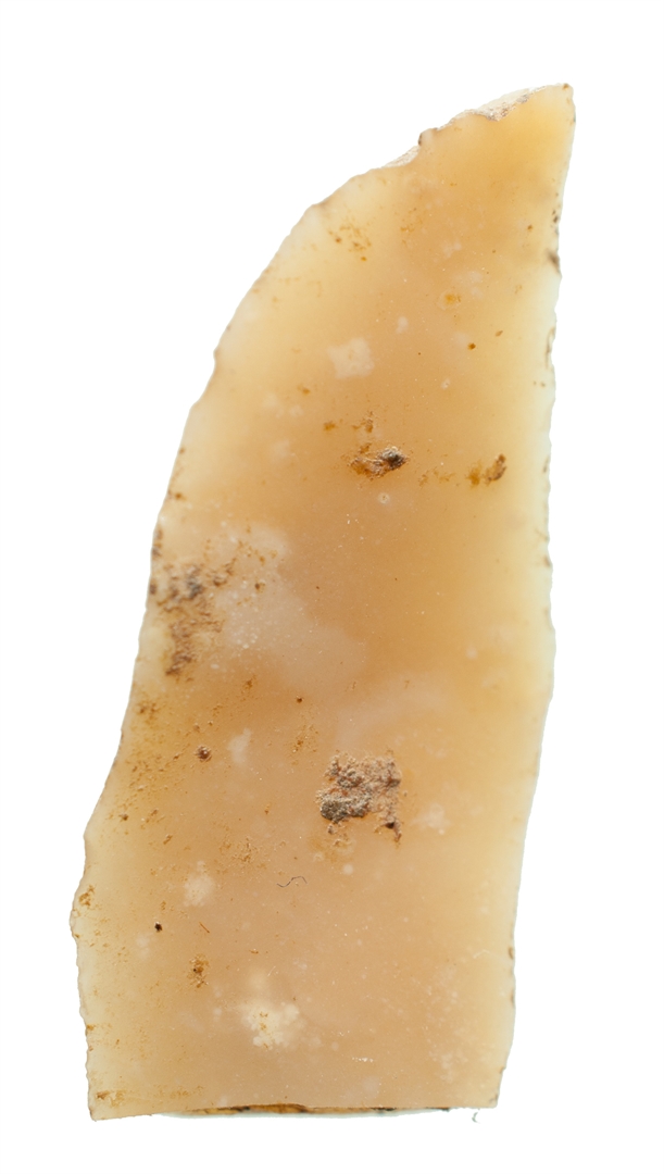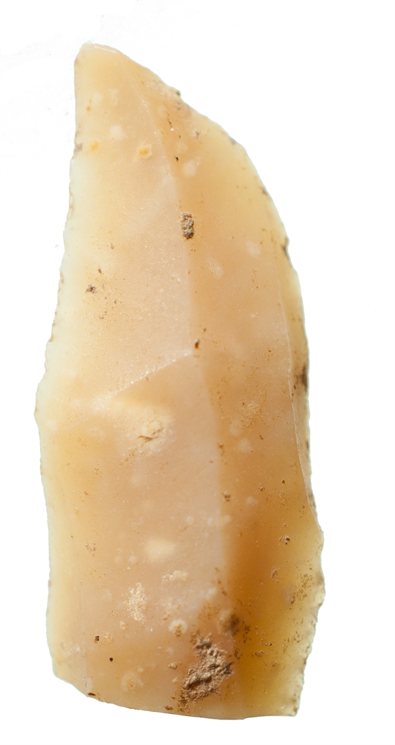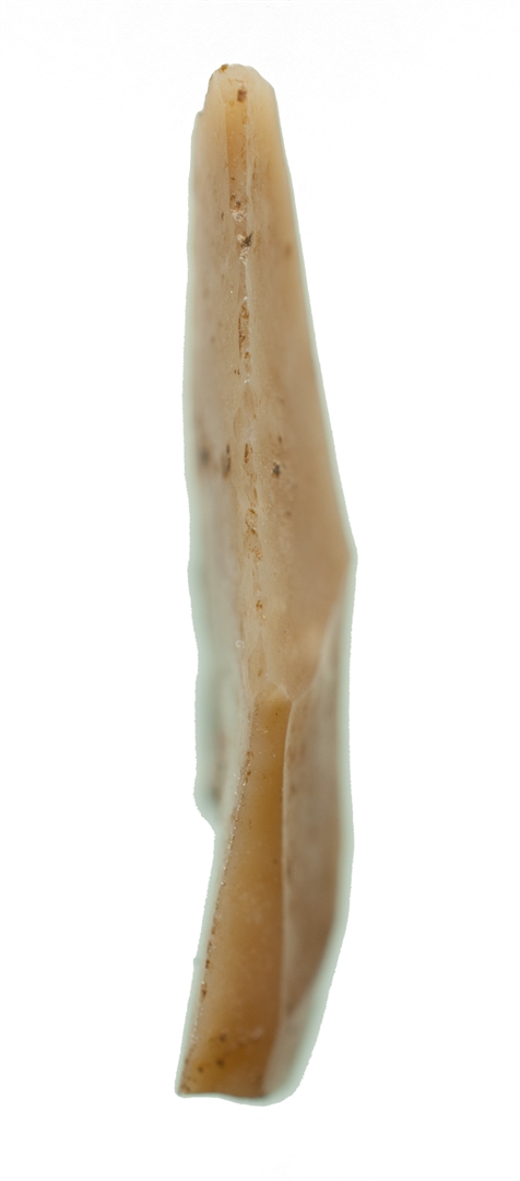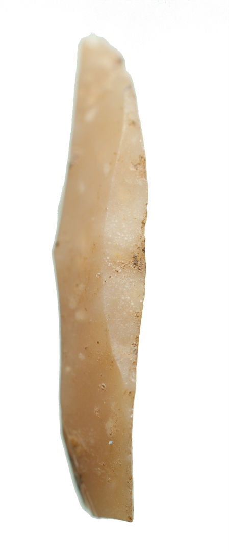 Kremeni nož prema gore izvijenog vrha. Nedostaje dio kraja noža.