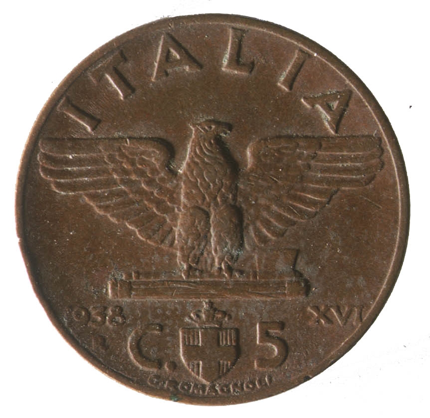 Orao raširenih krila koji u kanđama drži fascio, iznad kojeg je natpis ITALIA. Ispod fascia, sa desne strane, nalazi se godina 1938. a ispod nje veliko slovoR. Sa desne strane rimski broj XVI. Na dnu se nalazi grb, a ispod njega natpis O. ROMACNOLI. Sa lijeve strane grba nalazi se slovo C. , a sa desne strane broj 5.