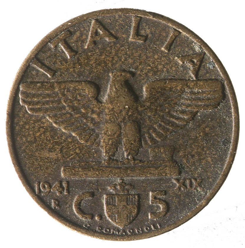 Orao raširenih krila koji u kanđama drži fascio, iznad kojeg je natpis ITALIA. Ispod fascia, sa desne strane, nalazi se godina 1941. a ispod nje veliko slovoR. Sa desne strane rimski broj XIX. Na dnu se nalazi grb, a ispod njega natpis O. ROMACNOLI. Sa lijeve strane grba nalazi se slovo C. , a sa desne strane broj 5.