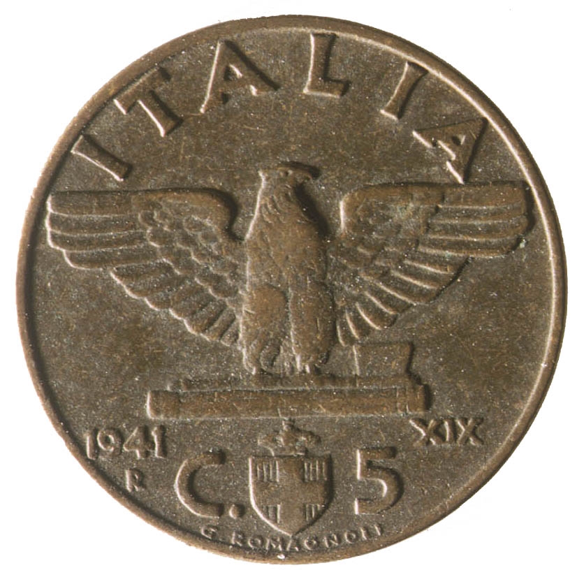 Orao raširenih krila koji u kanđama drži fascio, iznad kojeg je natpis ITALIA. Ispod fascia, sa desne strane, nalazi se godina 1941. a ispod nje veliko slovoR. Sa desne strane rimski broj XIX. Na dnu se nalazi grb, a ispod njega natpis O. ROMACNOLI. Sa lijeve strane grba nalazi se slovo C. , a sa desne strane broj 5.