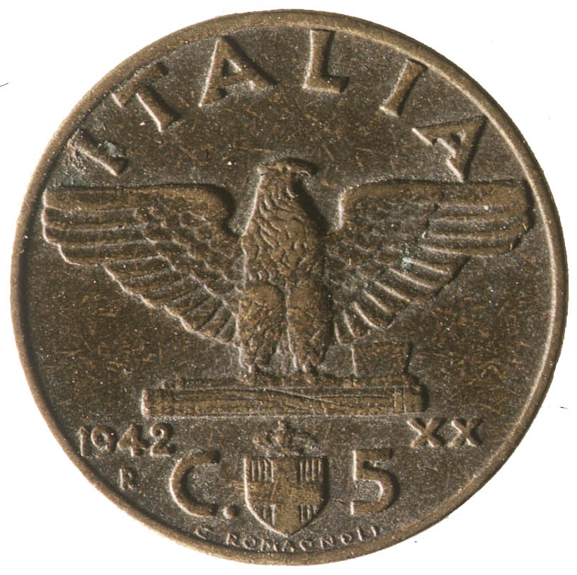 Orao raširenih krila koji u kanđama drži fascio, iznad kojeg je natpis ITALIA. Ispod fascia, sa desne strane, nalazi se godina 1942. a ispod nje veliko slovoR. Sa desne strane rimski broj XX. Na dnu se nalazi grb, a ispod njega natpis O. ROMACNOLI. Sa lijeve strane grba nalazi se slovo C. , a sa desne strane broj 5.