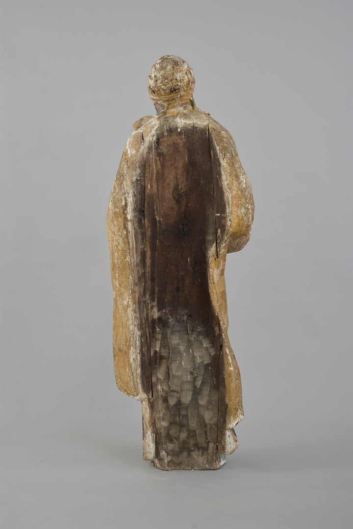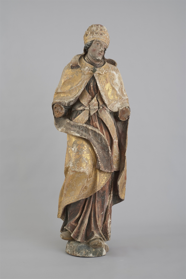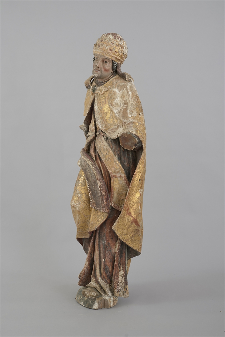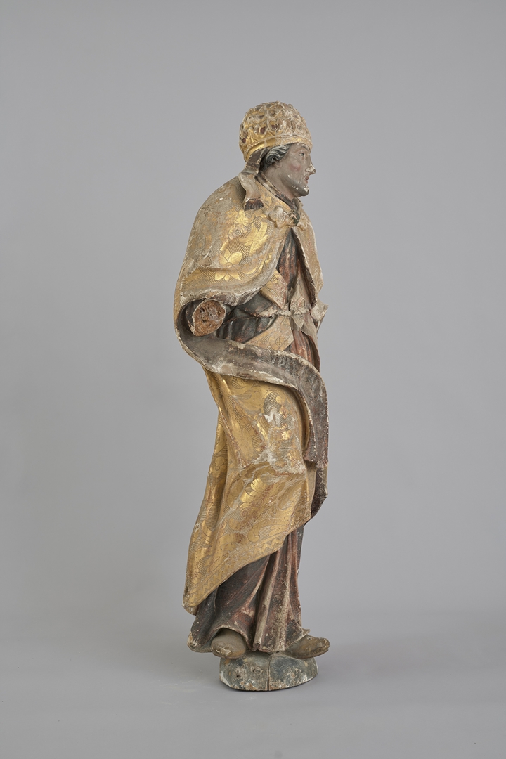 Figura pape sa tiarom zlatnom i crvenom na glavi. Glava nagnuta na lijevom ramenu, Kosa crna, bez brade. Haljina tamnocrvena, stola zlatna i franjevačko uže. Plašt od zlatnog damaska spojen na grudima medaljonom zelene boje. Postava tamnocrvena. Cipele žute. Crni sta lak. (Inventarna knjiga 1-3, 1. tom)