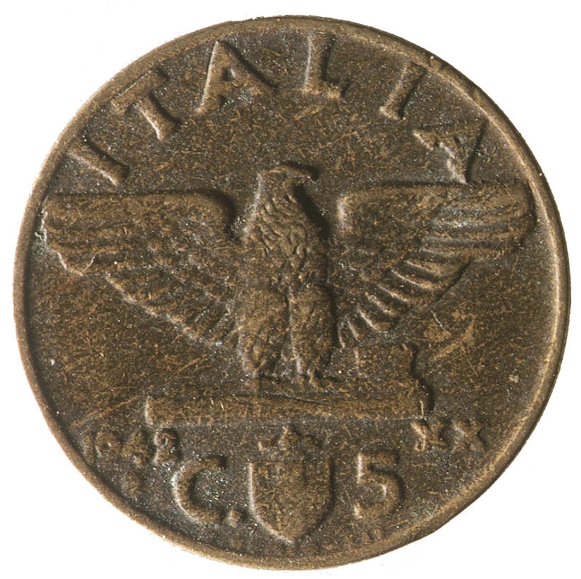 Avers: Centralni dio kovanice zauzima profil osobe sa pogledom u desno. Sa njegove lijeve strane nalazi se djelomično izlizan natpis VITT. EM., a sa njegove desne strane natpis III.RE.E.IMP. Revers: Orao raširenih krila koji u kanđama drži fascio, iznad kojeg je natpis ITALIA. Ispod fascia, sa desne strane, nalazi se godina 1942. a ispod nje veliko slovoR. Sa desne strane rimski broj XX. Na dnu se nalazi grb, a ispod njega natpis O. ROMACNOLI. Sa lijeve strane grba nalazi se slovo C. , a sa desne strane broj 5.