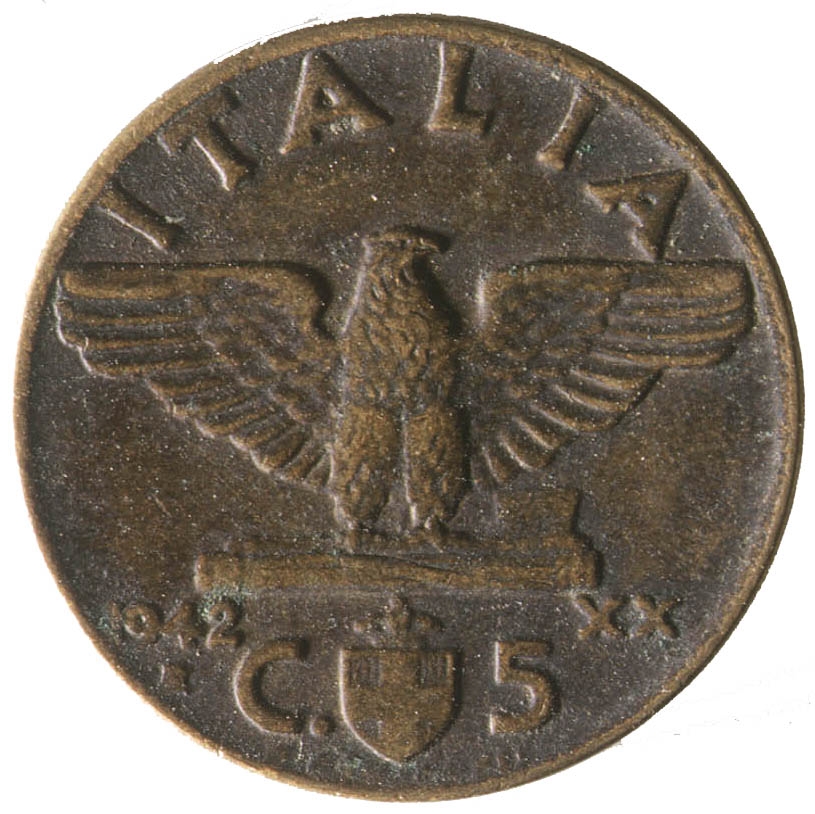 Orao raširenih krila koji u kanđama drži fascio, iznad kojeg je natpis ITALIA. Ispod fascia, sa desne strane, nalazi se godina 1942. a ispod nje veliko slovoR. Sa desne strane rimski broj XX. Na dnu se nalazi grb, a ispod njega natpis O. ROMACNOLI. Sa lijeve strane grba nalazi se slovo C. , a sa desne strane broj 5.