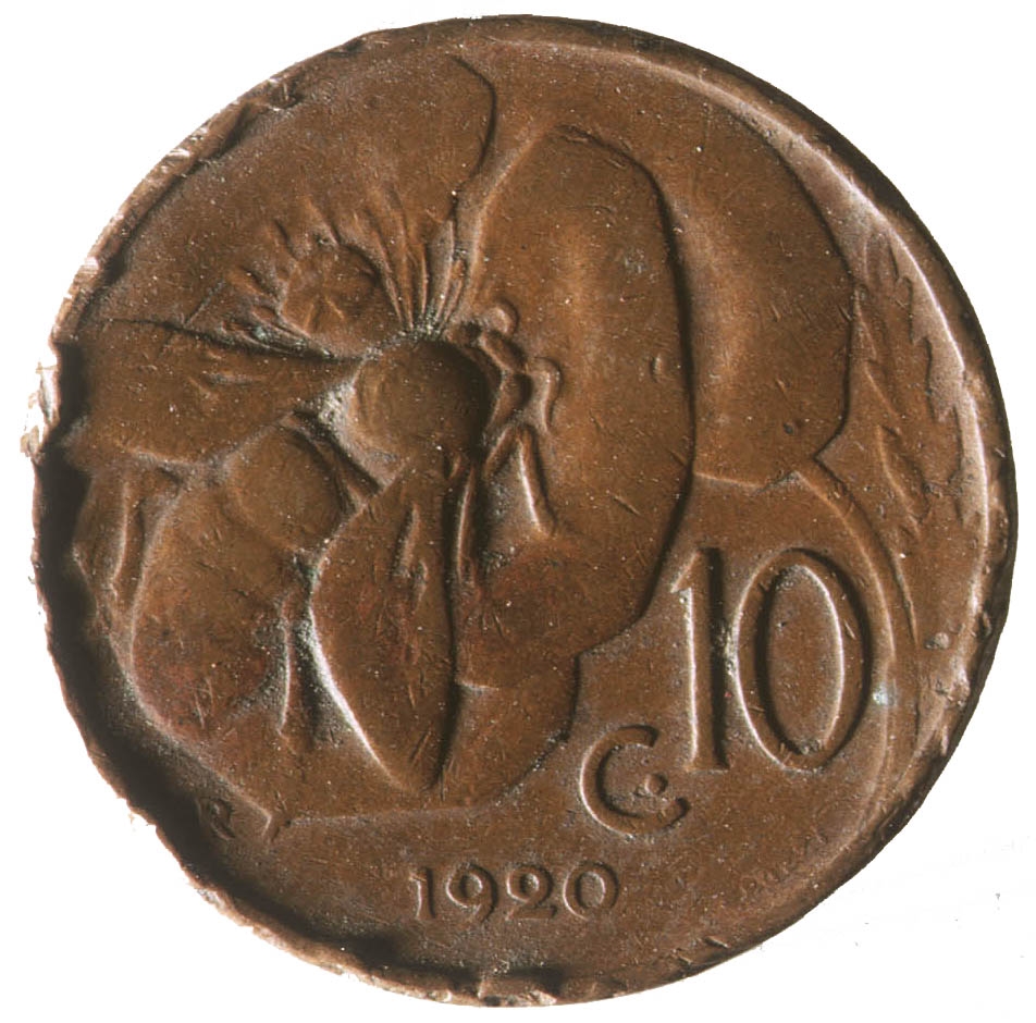 Dvije trećine površine zauzima prikaz pčele na cvijetu. Uz desni doljnji rub kovanice nalazi se natpis c10, a uz lijevi donji rub veliko slovo R. Na samon dnu nalazi se godina 1920.
