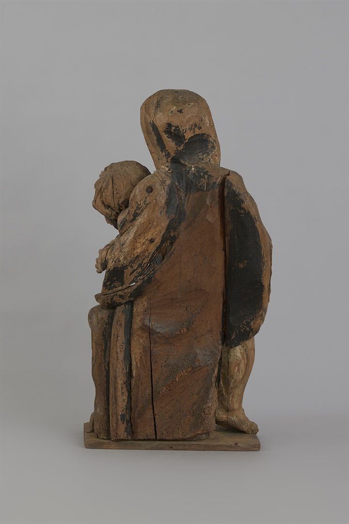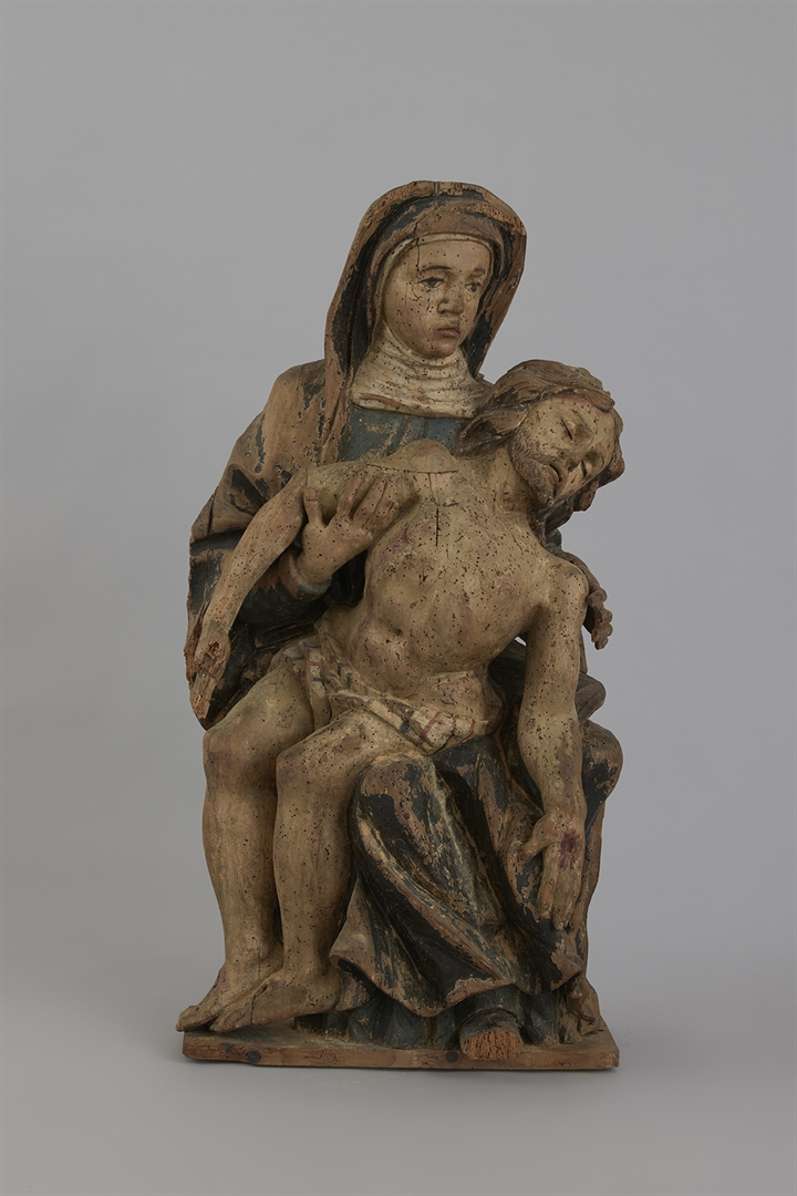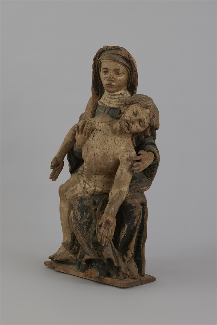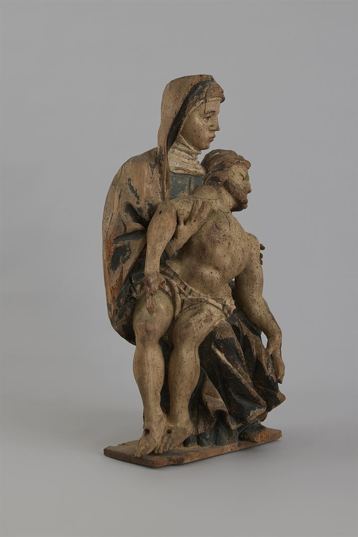 Madona sjedi i u krilu drži mrtvog Isusa. Desnom rukom ga pridržava ispod desne ruke a lijevom ga samo takne na ramenima. Madona ima crnu haljinu i plašt. Ispod plašta na glavi visi bijeli veo, koji je omotan i oko vrata. Lice tužno. Inkarnat maslinasti. Isus ima spuštenu glavu i patnički izraz sa poluotvorenim usnama. Ima kratku bradu i brkove. Obnaženo tijelo ogrnuto samo maramom sa crvenim i crnim prugama. Figura oštećena crvotočinom. Farba otpala na više mjesta. (Inventarna knjiga 1-3, 1. tom)