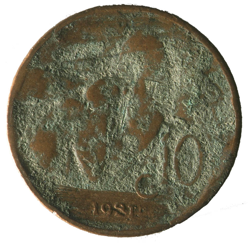 Avers: Centralni dio kovanice zauzima profil osobe sa pogledom u lijevo. Uz rub cijele kovanice proteže se natpis VITTORIO EMANVELE III RE D''ITALIA. Revers: Dvije trećine površine zauzima prikaz pčele na cvijetu. Uz desni doljnji rub kovanice nalazi se natpis c10, a uz lijevi donji rub veliko slovo R. Na samon dnu nalazi se godina 1921.