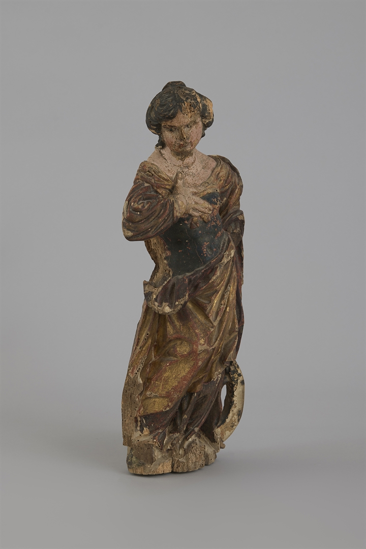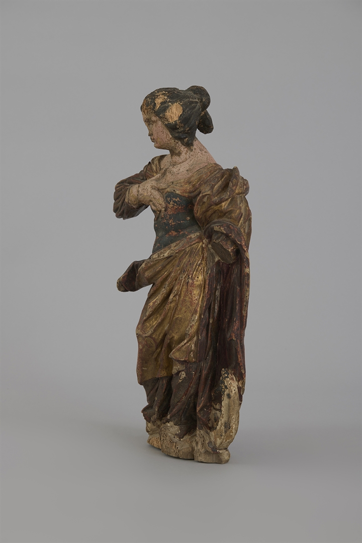 Žena sa crnom kosom očešljanom prema gore. Haljina bogato naborana i dekoltirana. na grudima položila je desnu ruku, lijeva ruka fali. Na lijevom ramenu plašt koji se spušta do poda. Kraj lijeve noge je mučenički kotač. (Inventarna knjiga 1-3, 1. tom)