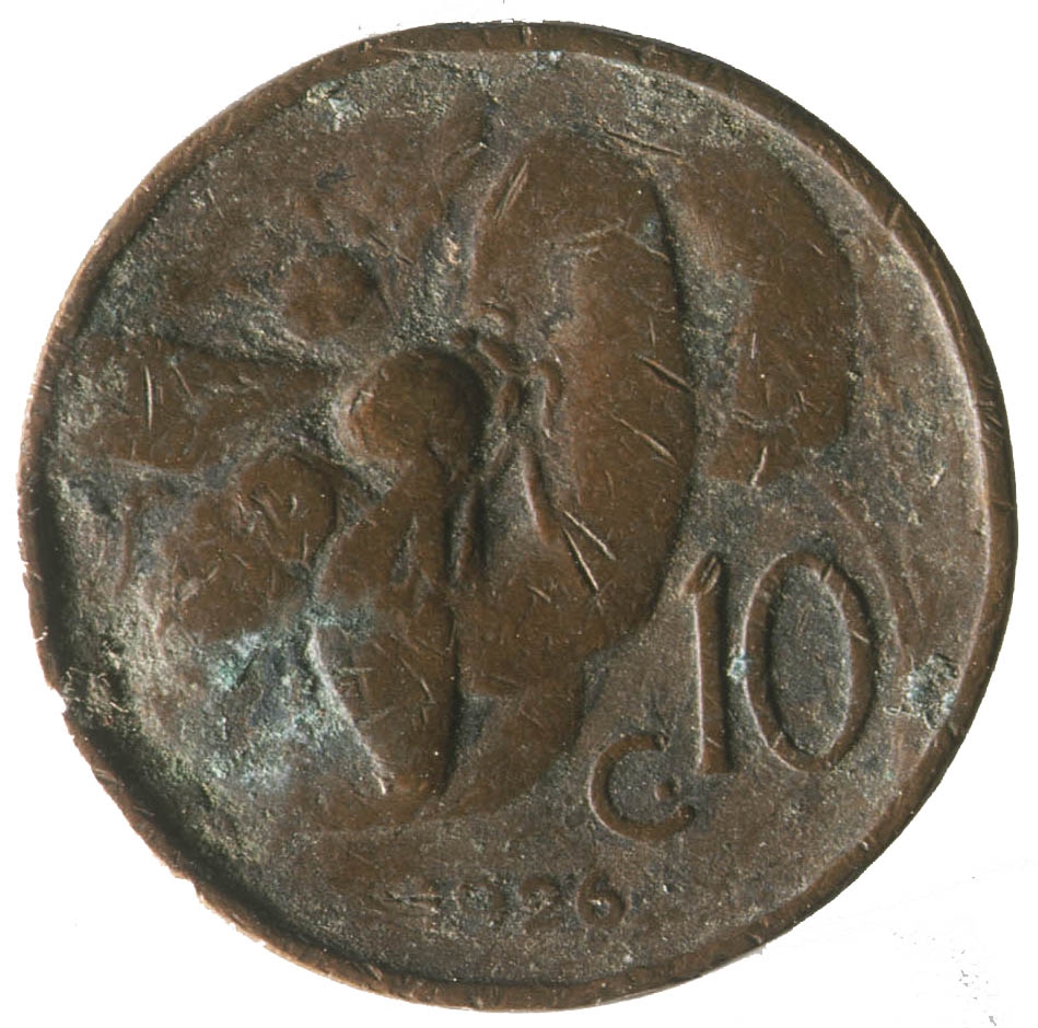 Avers: Centralni dio kovanice zauzima profil osobe sa pogledom u lijevo. Uz rub cijele kovanice proteže se natpis VITTORIO EMANVELE III RE D''ITALIA. Revers: Dvije trećine površine zauzima prikaz pčele na cvijetu. Uz desni doljnji rub kovanice nalazi se natpis c10, a uz lijevi donji rub veliko slovo R. Na samon dnu nalazi se godina 1926. Kovanica je načeta korozijom.